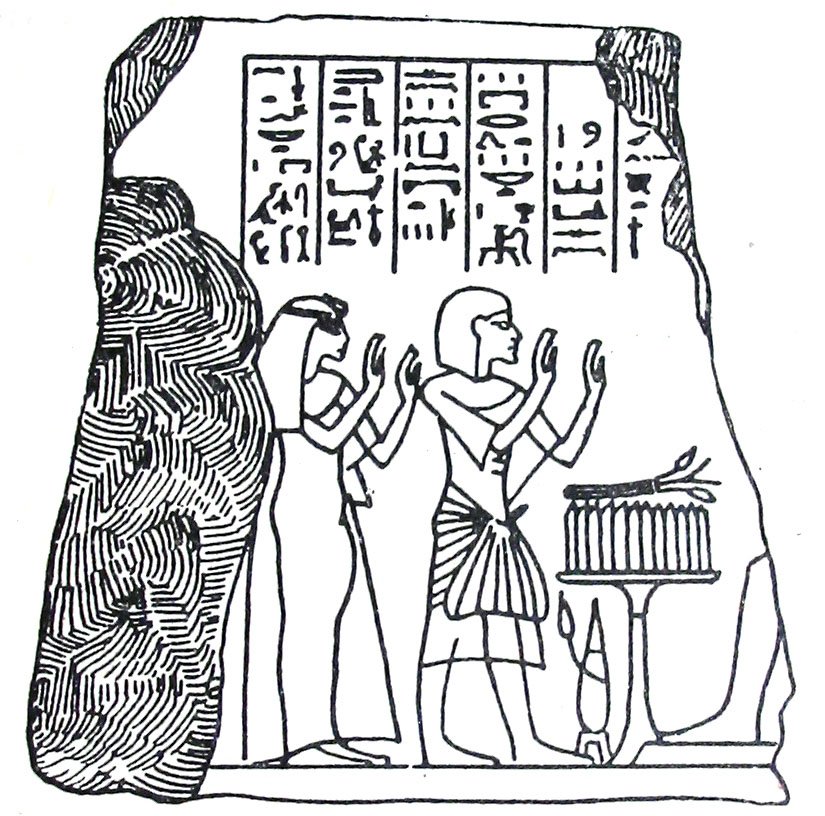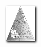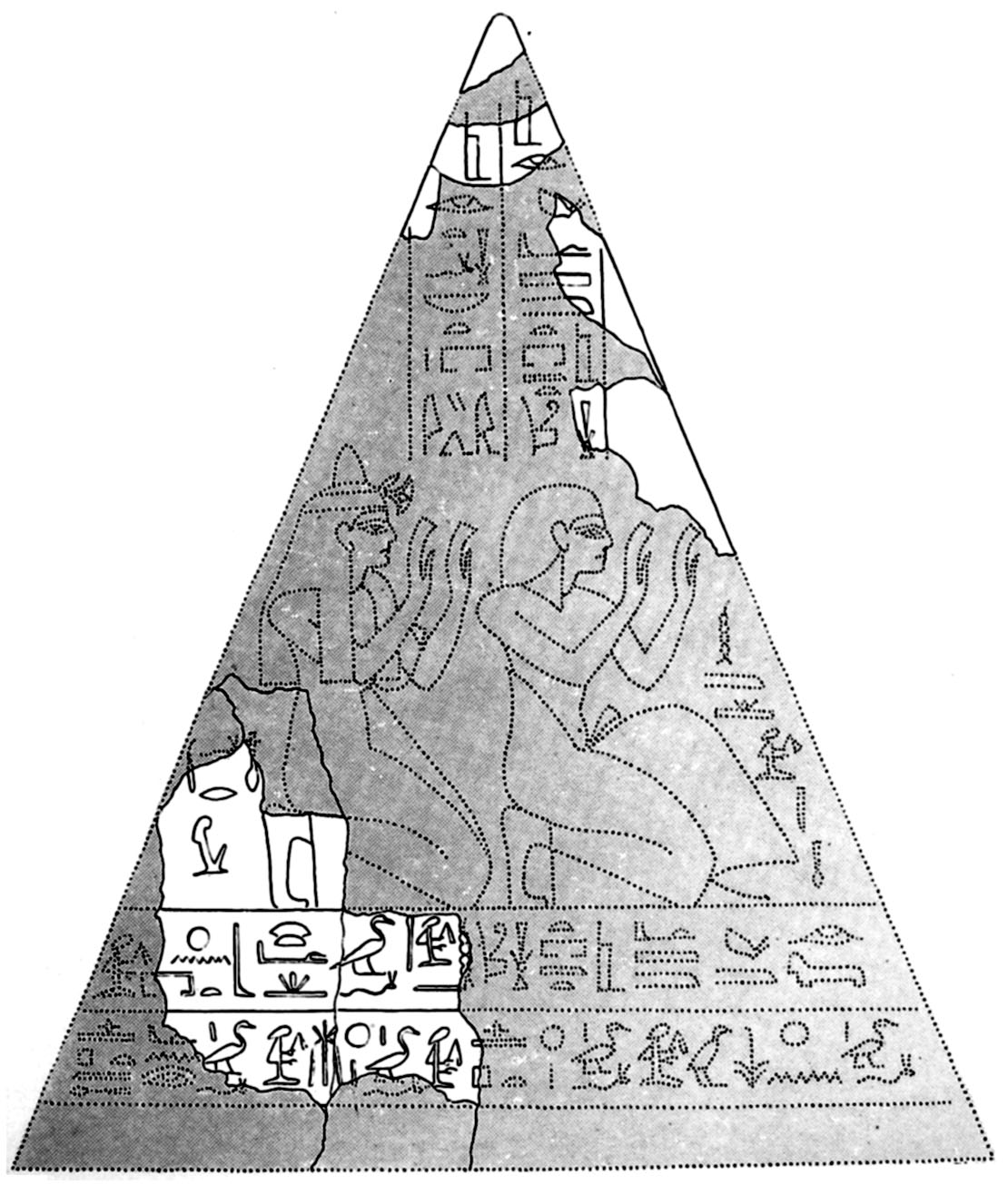 tt001_00_3509: TT001 Sennedjem – Ponta da Pirâmide Externa – Casal em adoração. BRUYÈRE, Bernard. La tombe no. 1 de Sen-nedjem à Deir el-Médineh. Le Caire, Imprimerie de l'Institut Français d'Archeologie Orientale. 1959. Mémoires de l'Institut Français d'Archéologie Orientale, 88. [PL XI]. |