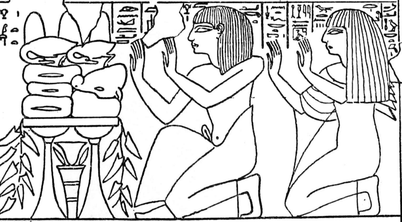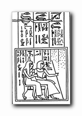 tt216_ni_0001: TT216 Neferhotep – parede não identificada Lintel em calc&ário: Direita - Neferhotep e seu irmão Pasched adoram a MertSeger; Esquerda - Neferhotep e sua esposa adoram Rannout. BRUYÈRE, M. Bernard. "Rapport sur les fouilles de Deir el Médineh (1923-1924)" IN: IFAO, Fouilles de L'Institut Français d'Archéologie Orientale du Caire Année 1923-1924, tome 2ème, pt2. Le Caire: Imprimerie de L'Institut Français Orientale, 1925. [P&ág. 49 Fig. 2]. |