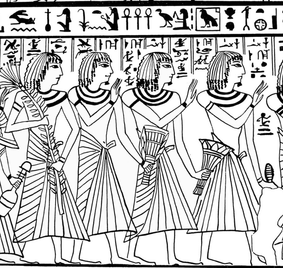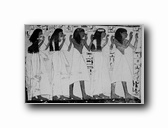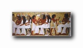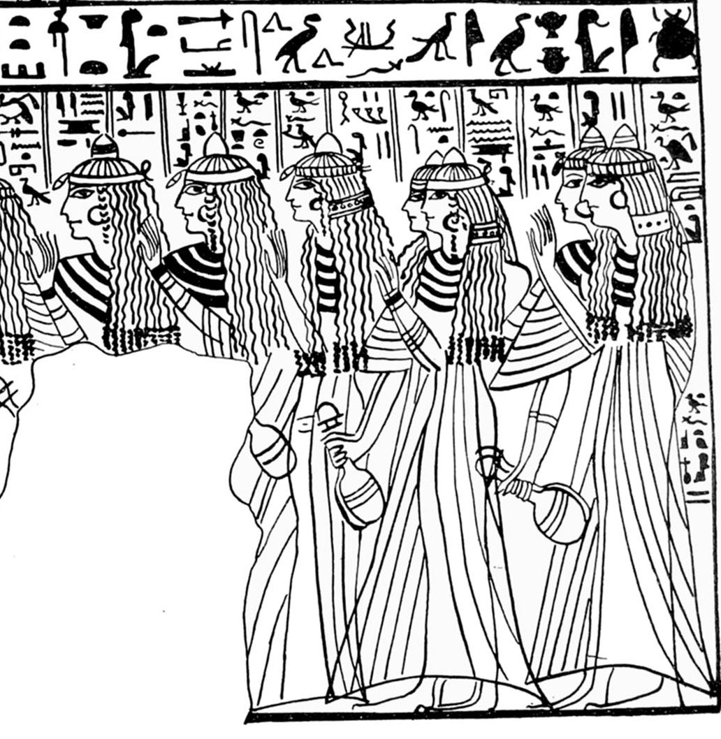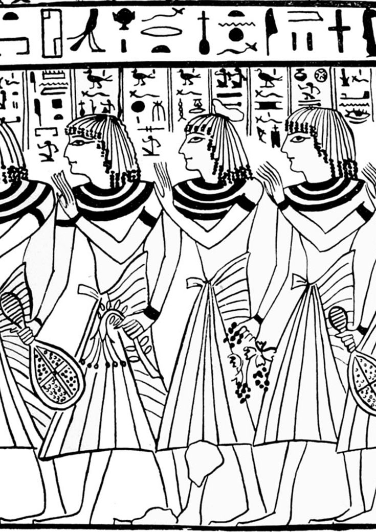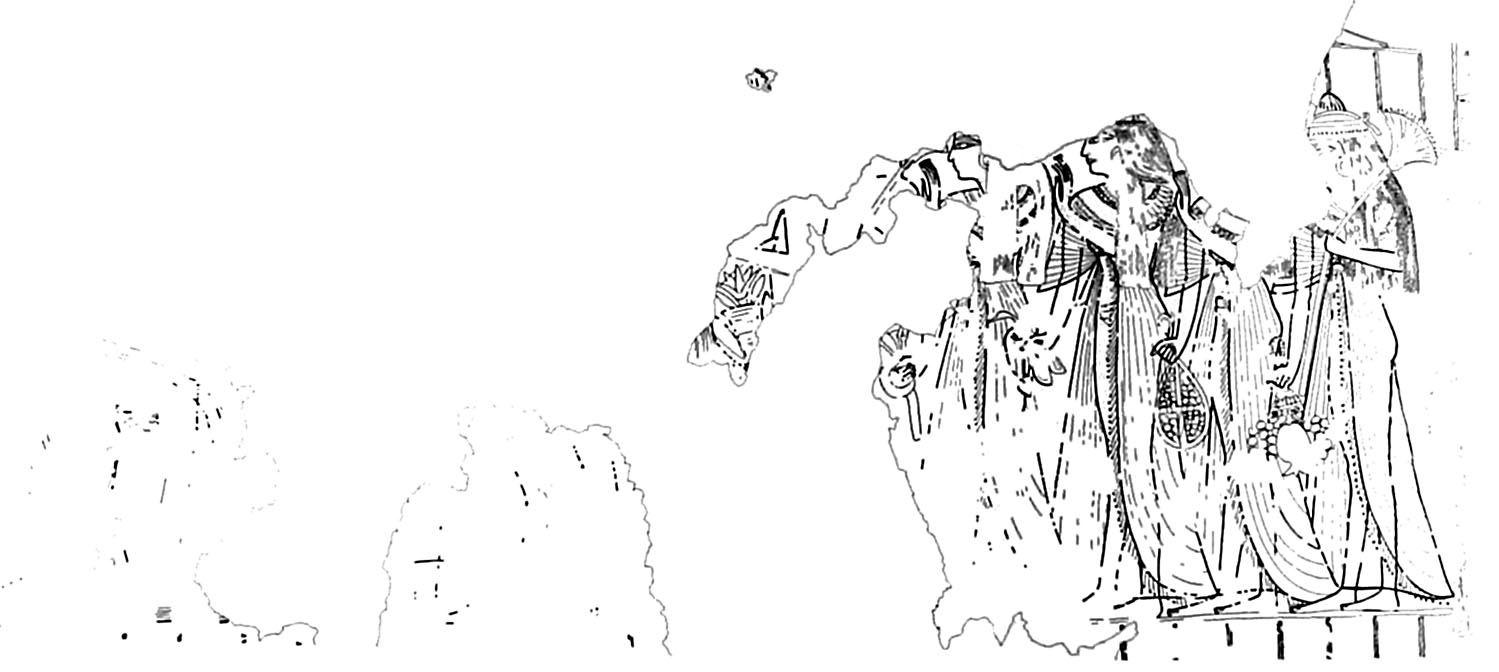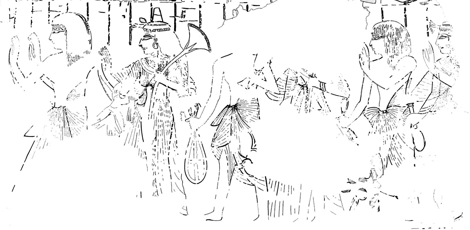 tt006_nib_0336: TT006 Neferhotepe & Nebnefer – parede não identificada Parede Leste parte superior. Casal sentado recebe homenagem de quatro homens e quatro mulheres (somente as mulheres foram consevadas). WILD, Henri. La tombe de Nefer hotep (I) et Neb Nefer à Deir el-Médîna (n. 6) et autres document les concernant II. Le Caire: Institut Français d'Archéologie Orientale, 1979 (Mémoires 103/2) [PL 7] (detalhe das moças) |