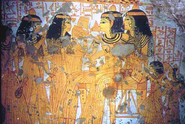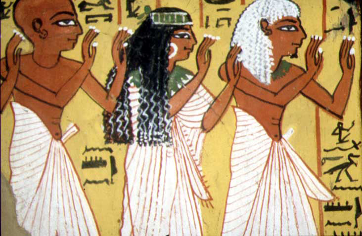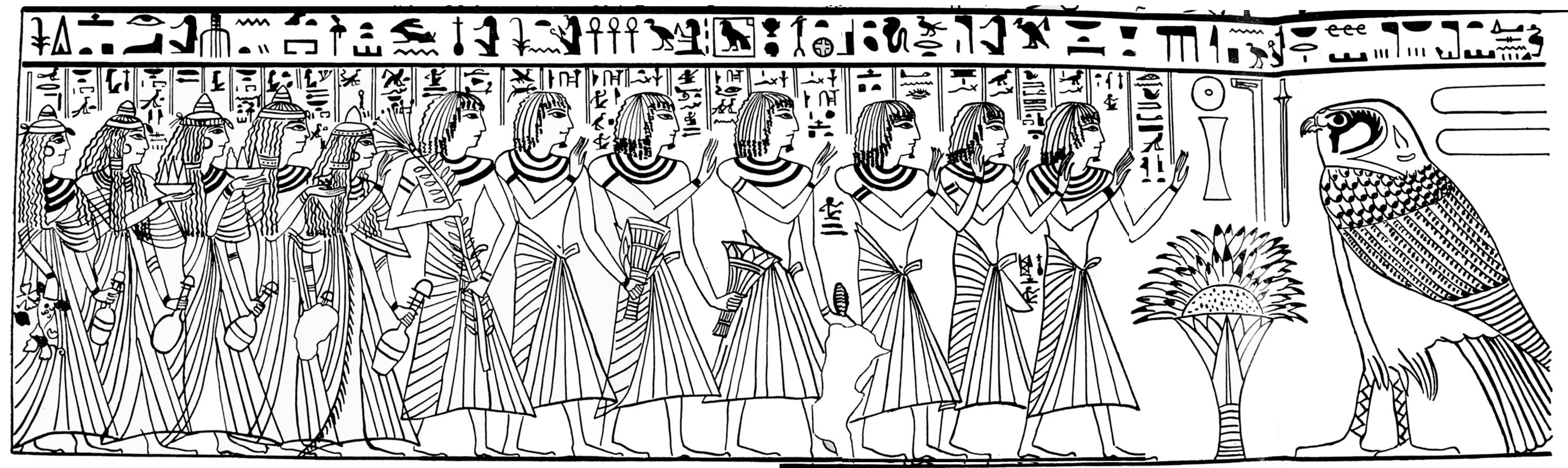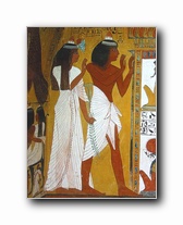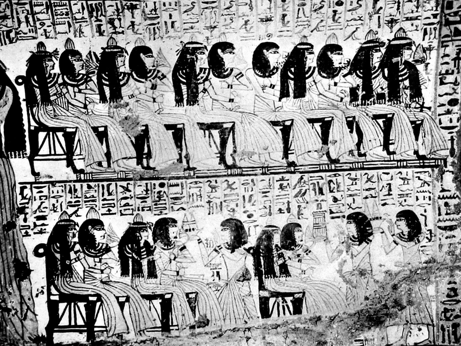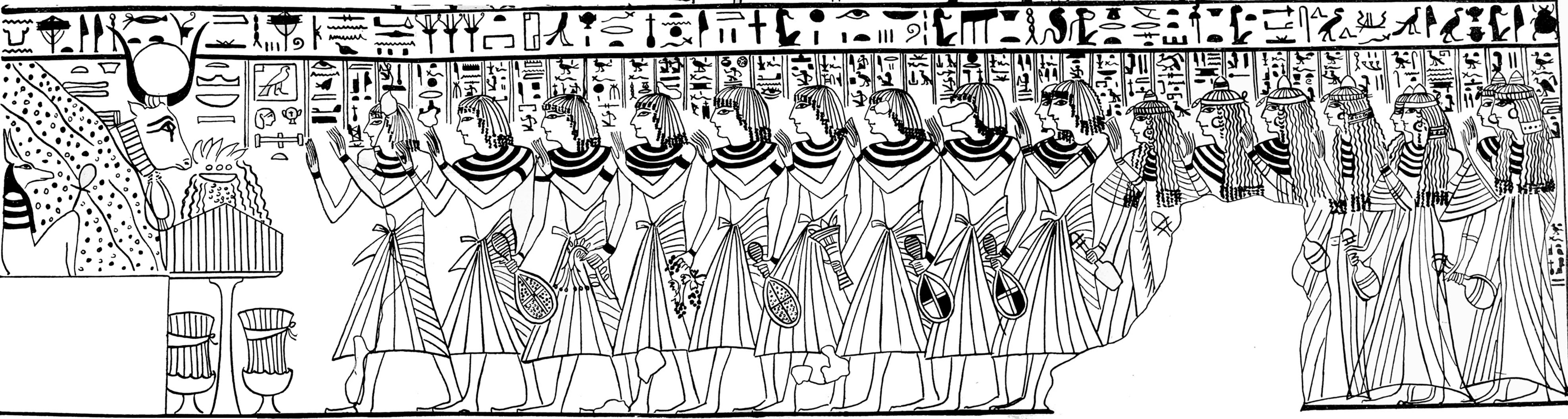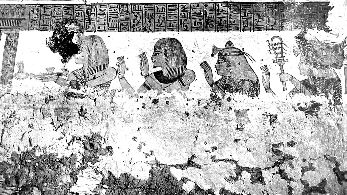 tt006_nib_0336: TT006 Neferhotepe & Nebnefer – parede não identificada Parede Leste parte superior. Casal sentado recebe homenagem de quatro homens e quatro mulheres (somente as mulheres foram consevadas). WILD, Henri. La tombe de Nefer hotep (I) et Neb Nefer à Deir el-Médîna (n. 6) et autres document les concernant II. Le Caire: Institut Français d'Archéologie Orientale, 1979 (Mémoires 103/2) [PL 7] (detalhe das moças) |