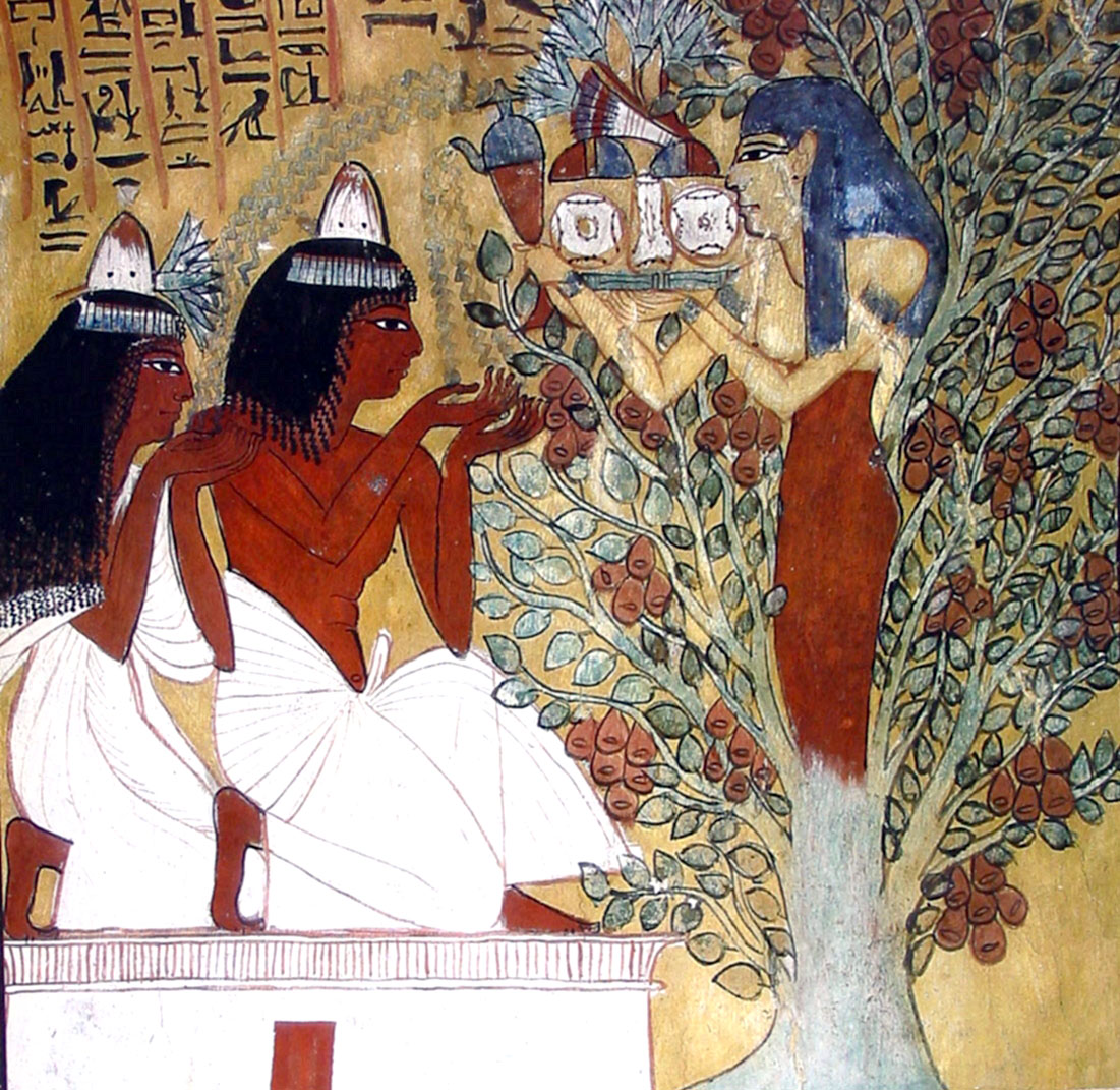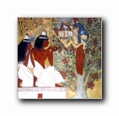 tt001_teto5_4899: TT001 Sennedjem – Teto, cena 5. Casal com deusa &árvore. A deusa &árvore faz oferendas e libação ao casal. SHEDID, Abdel Ghaffar. Das Grab des Sennedjem: ein Kunstlergrab de 19. Dynastie in Deir el Medineh. Mainz am Rhein: Verlag Philipp von Zabern, 1994. |