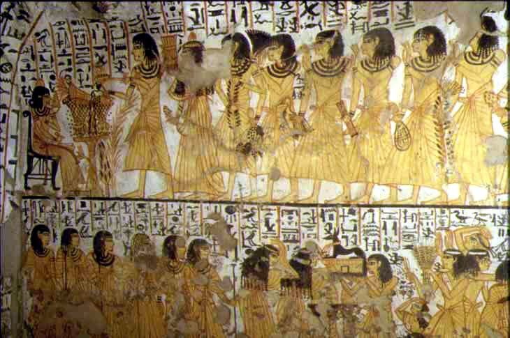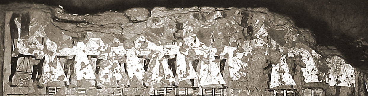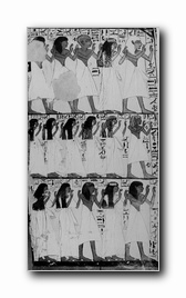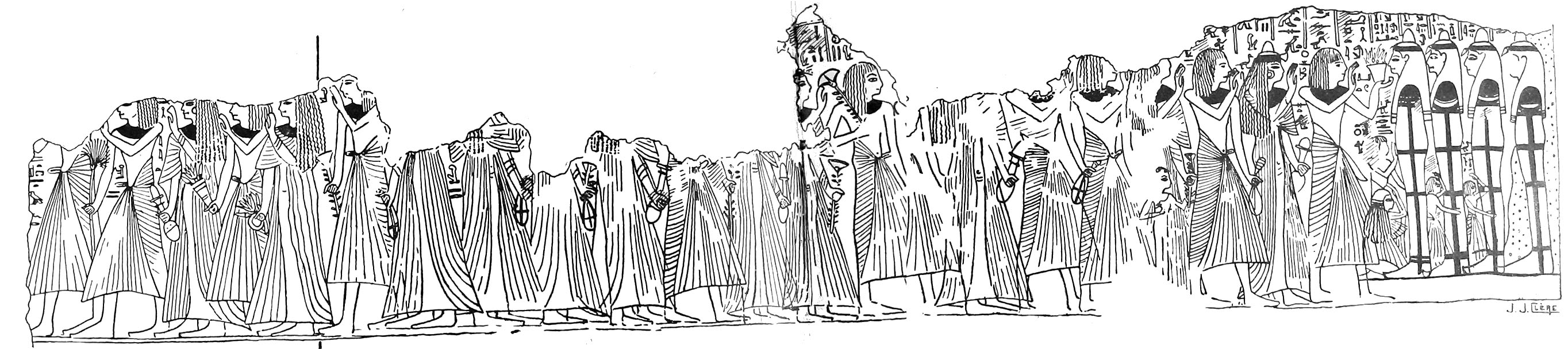 tt250_02-03_0131: TT250 Ra'mosi – paredes 2 e 3 Duas procissões funer&árias de homens e mulheres (procissão direita em direção a quatro múmias de mulheres. BRUYÈRE, M. Bernard. "Rapport sur les fouilles de Deir el Médineh (1926)" IN: IFAO, Fouilles de L'Institut Français d'Archéologie Orientale du Caire Année 1926, tome 4ème, pt3. Le Caire: Imprimerie de L'Institut Français Orientale, 1927. [PL V]. |