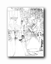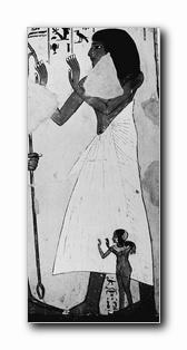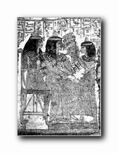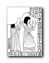 tt001_06_4831: TT001 Sennedjem – parede 06 – Filho Bunakhef fazendo libação diante do morto e família (esposa e filhos pequenos).(detalhe) SHEDID, Abdel Ghaffar. Das Grab des Sennedjem: ein Kunstlergrab de 19. Dynastie in Deir el Medineh. Mainz am Rhein: Verlag Philipp von Zabern, 1994. |