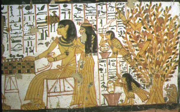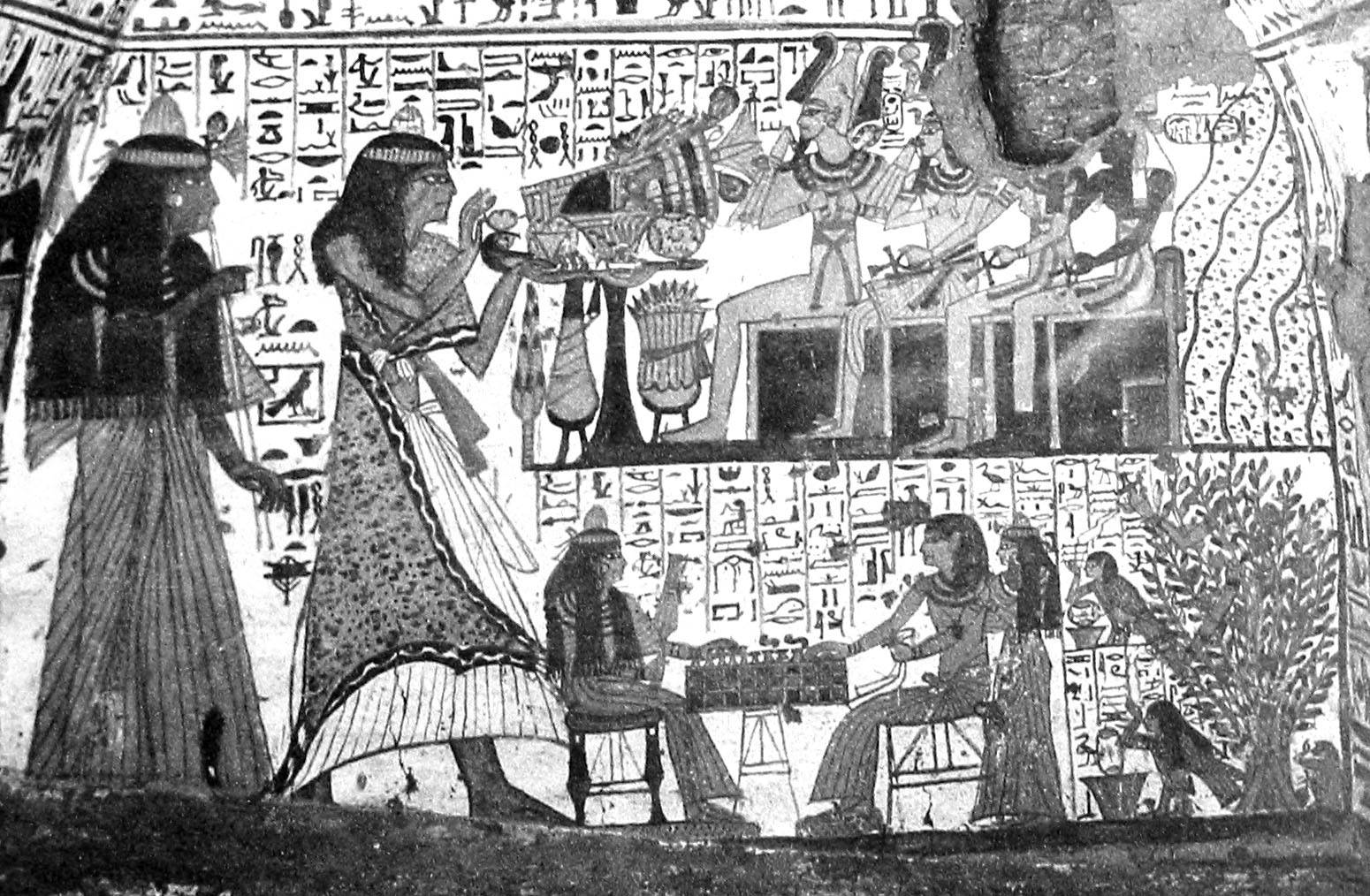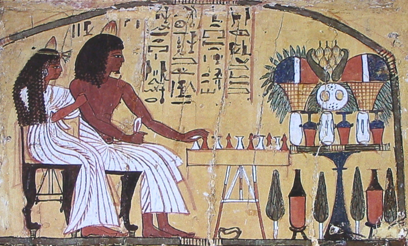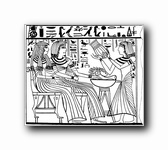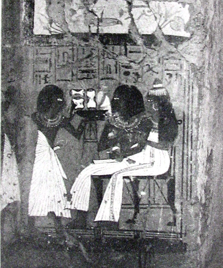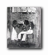 tt001_05X_4866: TT001 Sennedjem – parede 05 Face Interior – registro I. Falecido e esposa jogando Senet. SHEDID, Abdel Ghaffar. Das Grab des Sennedjem: ein Kunstlergrab de 19. Dynastie in Deir el Medineh. Mainz am Rhein: Verlag Philipp von Zabern, 1994. |