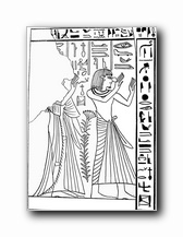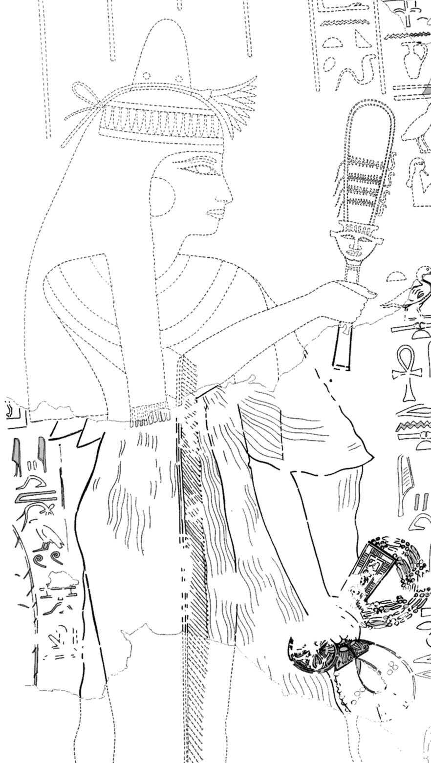 tt335_22b_5791: TT335 Nekhtamun – parede 22, cena 2 Esposa do filho com sistro diante de Maat. http://www.osirisnet.net/tombes/artisans/nakht335/photo/nak335_37.jpg BENDERITTER, Thierry (org.). http://www.osiris.net & LIVET, Jacques. Tombes et Mastabas de l'Ancienne Égypte. Paris: Jacques Livet Ed., s/d. (detalhe de cena em cor) |