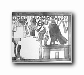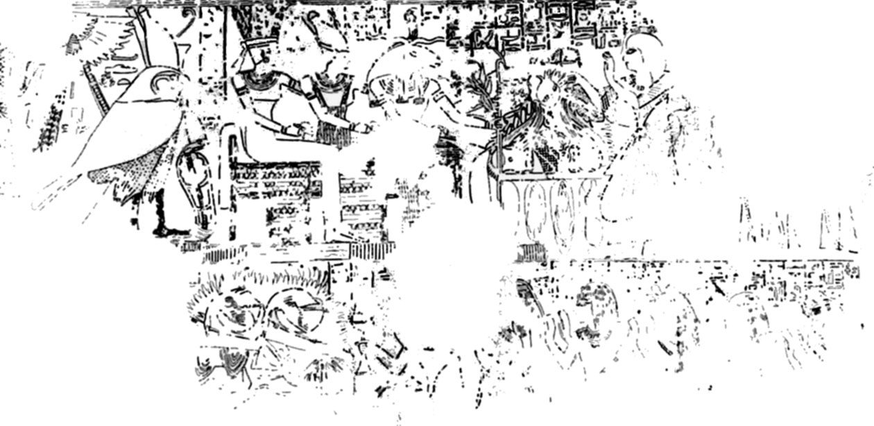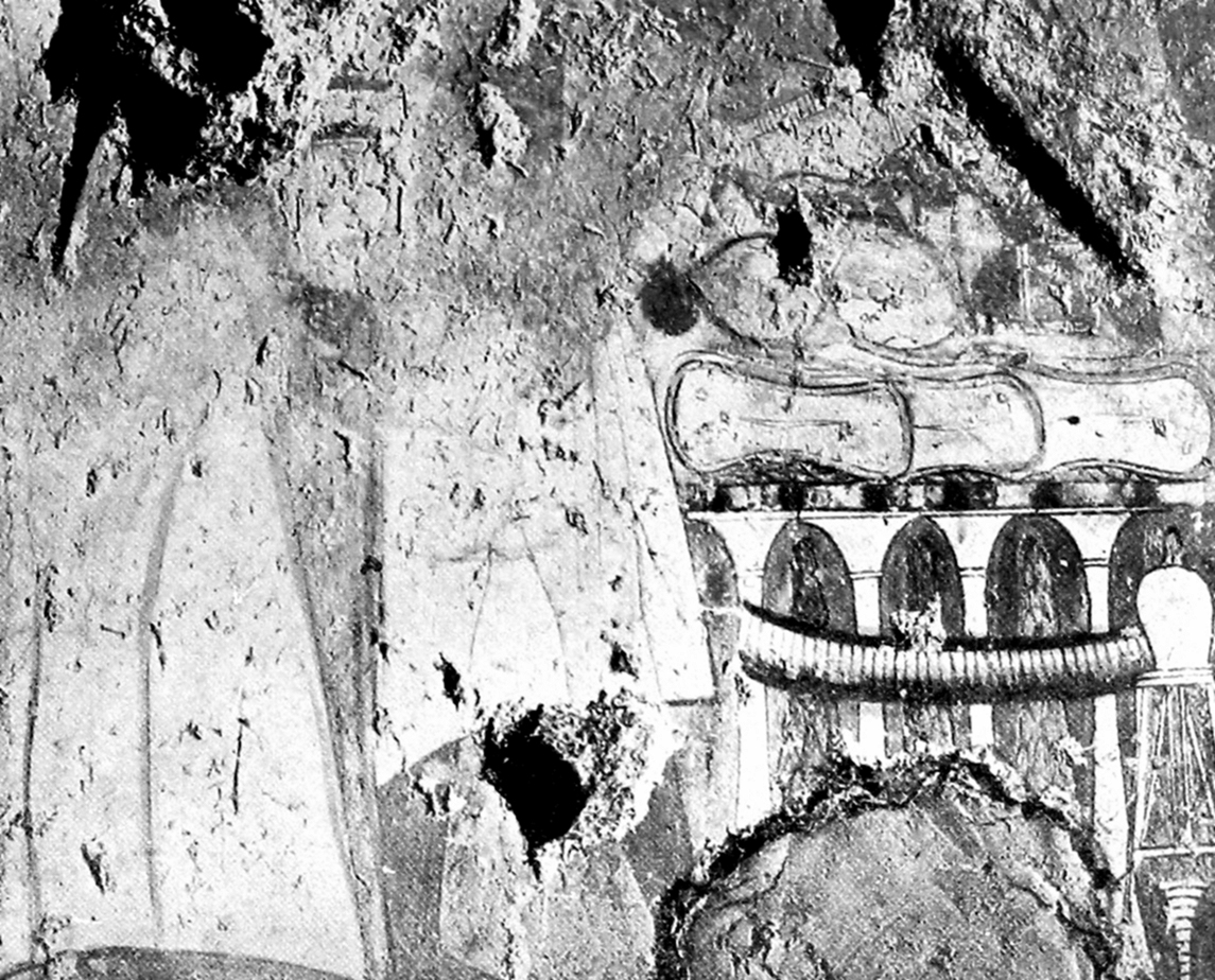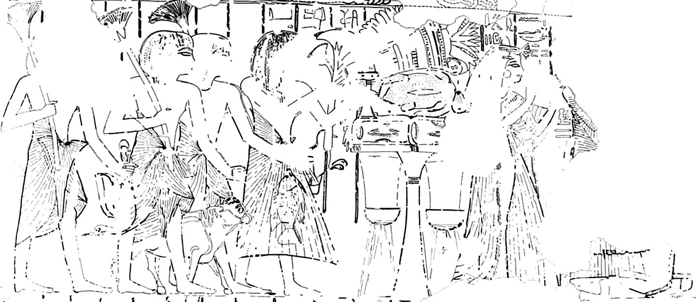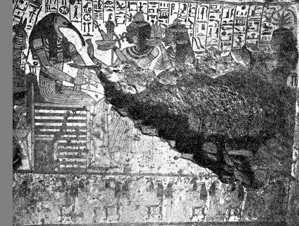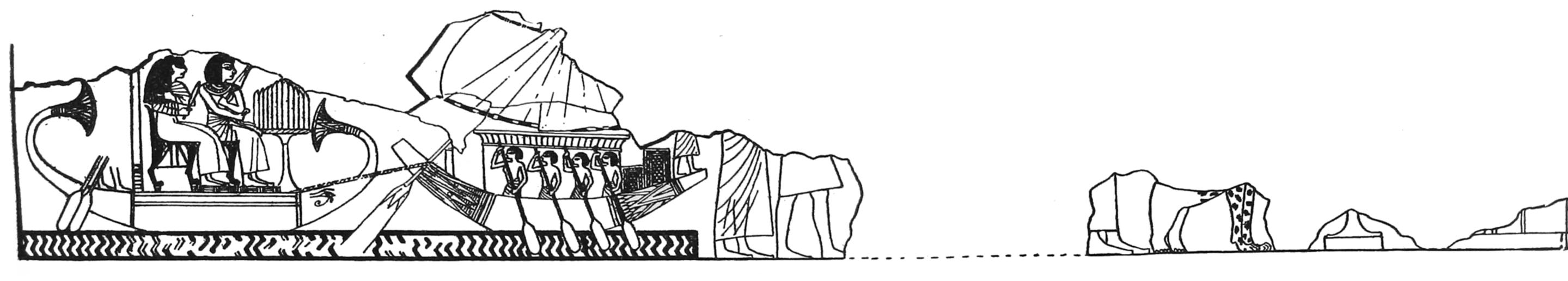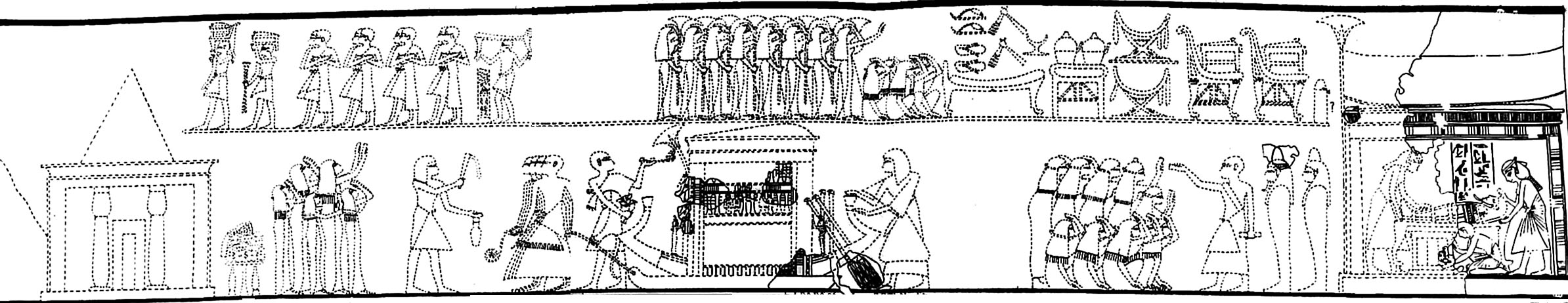 tt360_07_1673: TT360 Kaha (Qaha) – parede 7 Peregrinação à Abidos e Rito da Perna (foreleg-rite) na tumba-pirâmide. BRUYÈRE, M. Bernard. "Rapport sur les fouilles de Deir el Médineh (1930)" IN: IFAO, Fouilles de L'Institut Français d'Archéologie Orientale du Caire Année 1930, tome 8ème, pt3. Le Caire: Imprimerie de L'Institut Français Orientale, 1933. [PL XXVII Fig. 2]. |