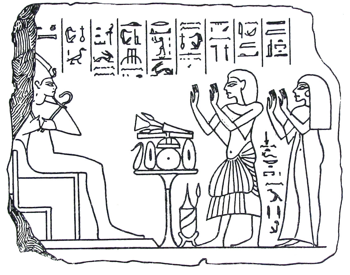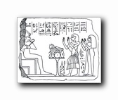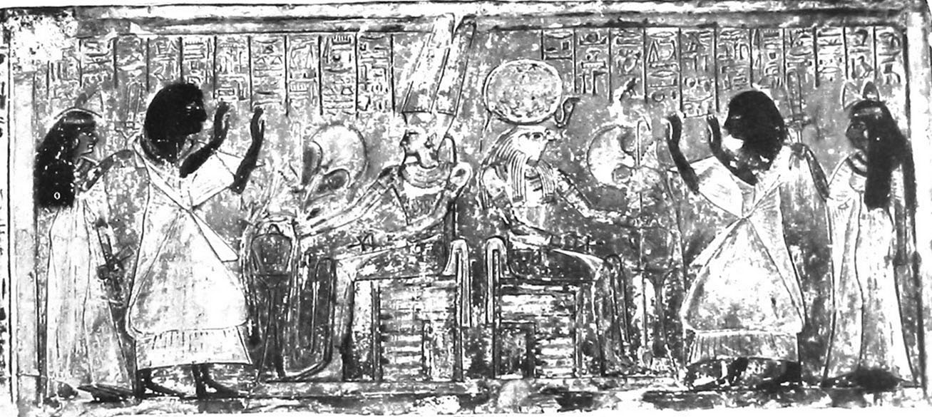 tt001_05I_4857: TT001 Sennedjem – parede 05 face externa – cena I. Falecido esposa e uma mulher diante de Osíres e Maat. SHEDID, Abdel Ghaffar. Das Grab des Sennedjem: ein Kunstlergrab de 19. Dynastie in Deir el Medineh. Mainz am Rhein: Verlag Philipp von Zabern, 1994. |