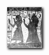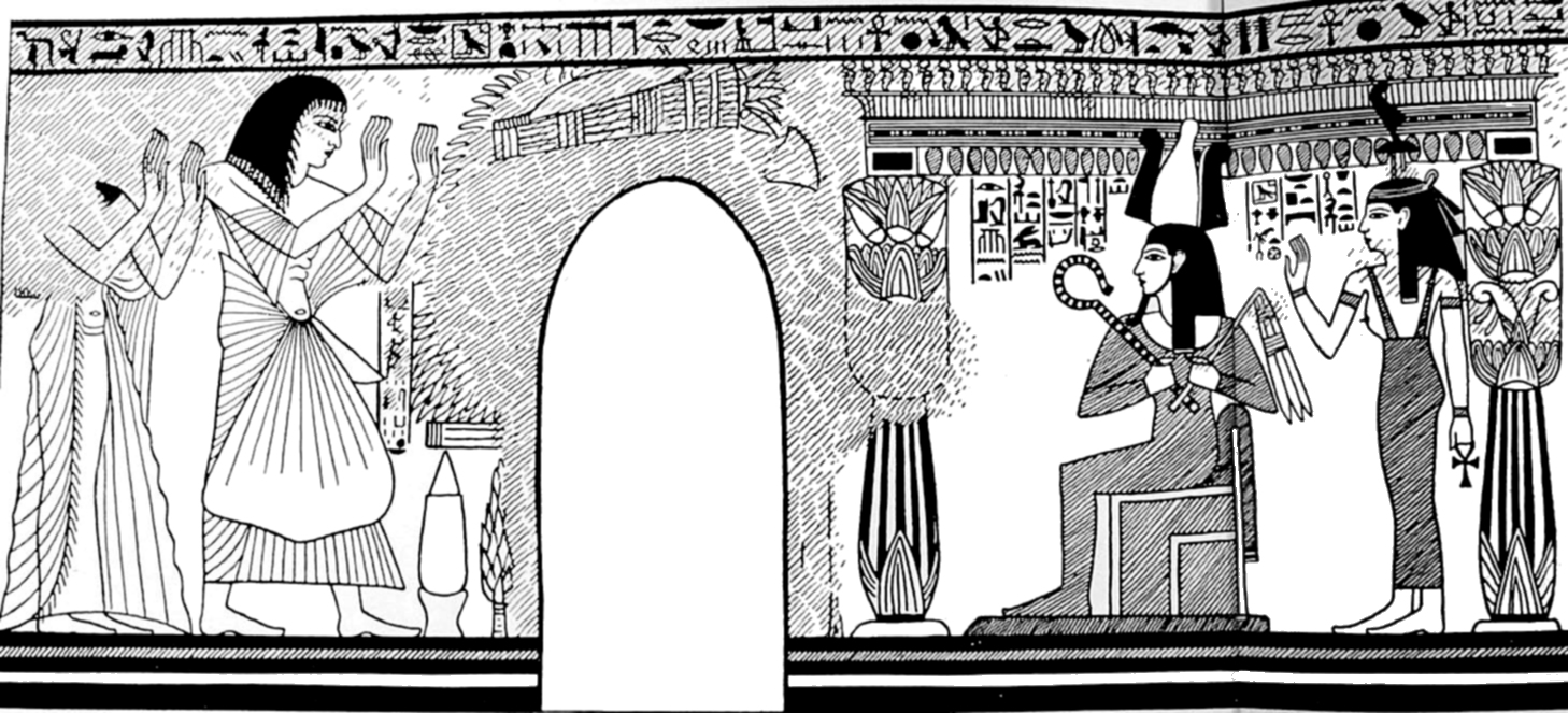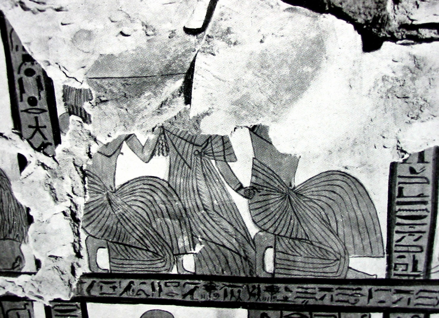 tt335_20_3281: TT335 Nekhtamun – parede 20 Morto e esposa (de costas um para o outro) abrem portões do mundo dos mortos e da eternidade respectivamente. BRUYÈRE, M. Bernard. "Rapport sur les fouilles de Deir el Médineh (1924-1925)" IN: IFAO, Fouilles de L'Institut Français d'Archéologie Orientale du Caire Année 1924-1925, tome 3ème, pt2. Le Caire: Imprimerie de L'Institut Français Orientale, 1926. [P&ág. 143 Fig. 94]. |