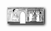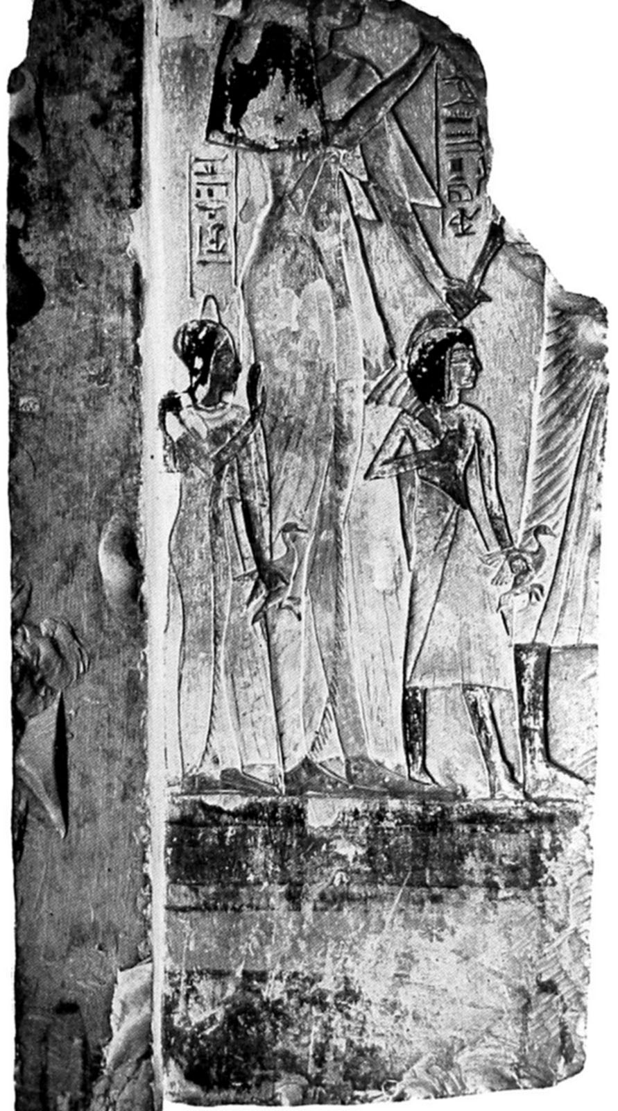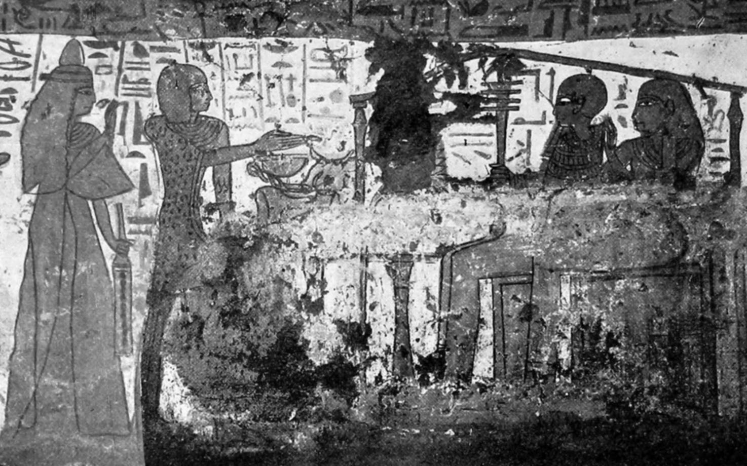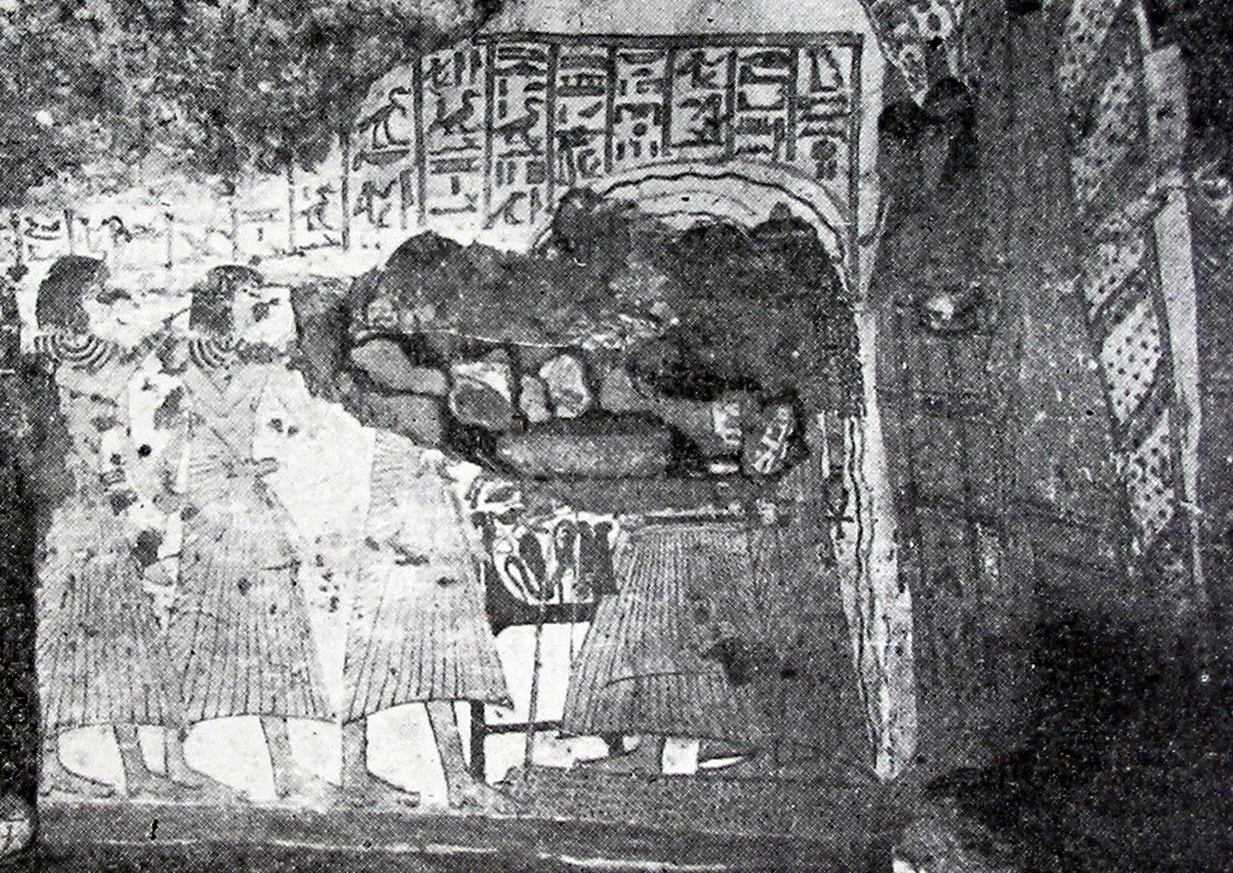 tt360_10_1677: TT360 Kaha (Qaha) – parede 10, câmara C P&ássaro benu e filho Huynufer como um sacerdote 'sem' com oferendas (cortadas pela entrada) diante do morto e esposa. BRUYÈRE, M. Bernard. "Rapport sur les fouilles de Deir el Médineh (1930)" IN: IFAO, Fouilles de L'Institut Français d'Archéologie Orientale du Caire Année 1930, tome 8ème, pt3. Le Caire: Imprimerie de L'Institut Français Orientale, 1933. [PL XXVIII Fig. 1]. |