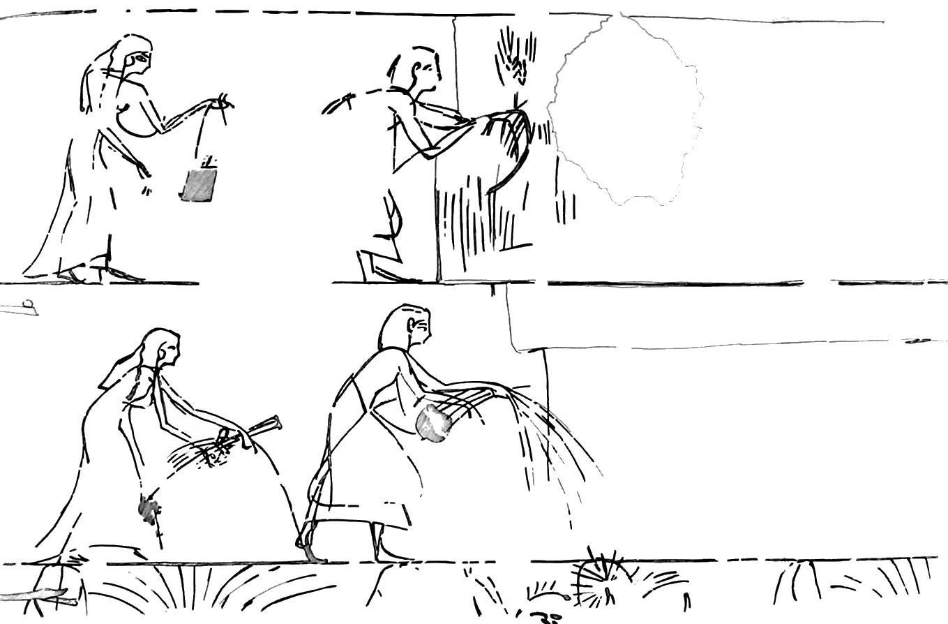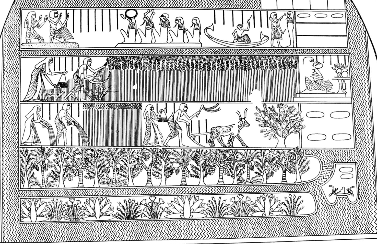 tt001_09_4887: TT001 Sennedjem – parede 09. Campos de Iaru – Plantio. SHEDID, Abdel Ghaffar. Das Grab des Sennedjem: ein Kunstlergrab de 19. Dynastie in Deir el Medineh. Mainz am Rhein: Verlag Philipp von Zabern, 1994. (Detalhe em cor) |