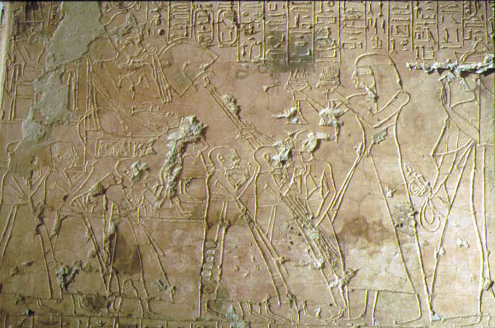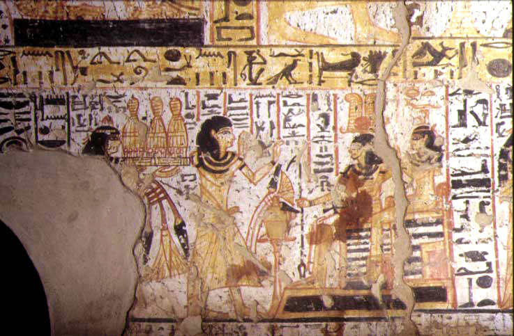tt335_16_5790: TT335 Nekhtamun – parede 16. http://www.osirisnet.net/tombes/artisans/nakht335/photo/nak335_13.jpg BENDERITTER, Thierry (org.). http://www.osiris.net & LIVET, Jacques. Tombes et Mastabas de l'Ancienne Égypte. Paris: Jacques Livet Ed., s/d. (detalhe de cena em cor) |