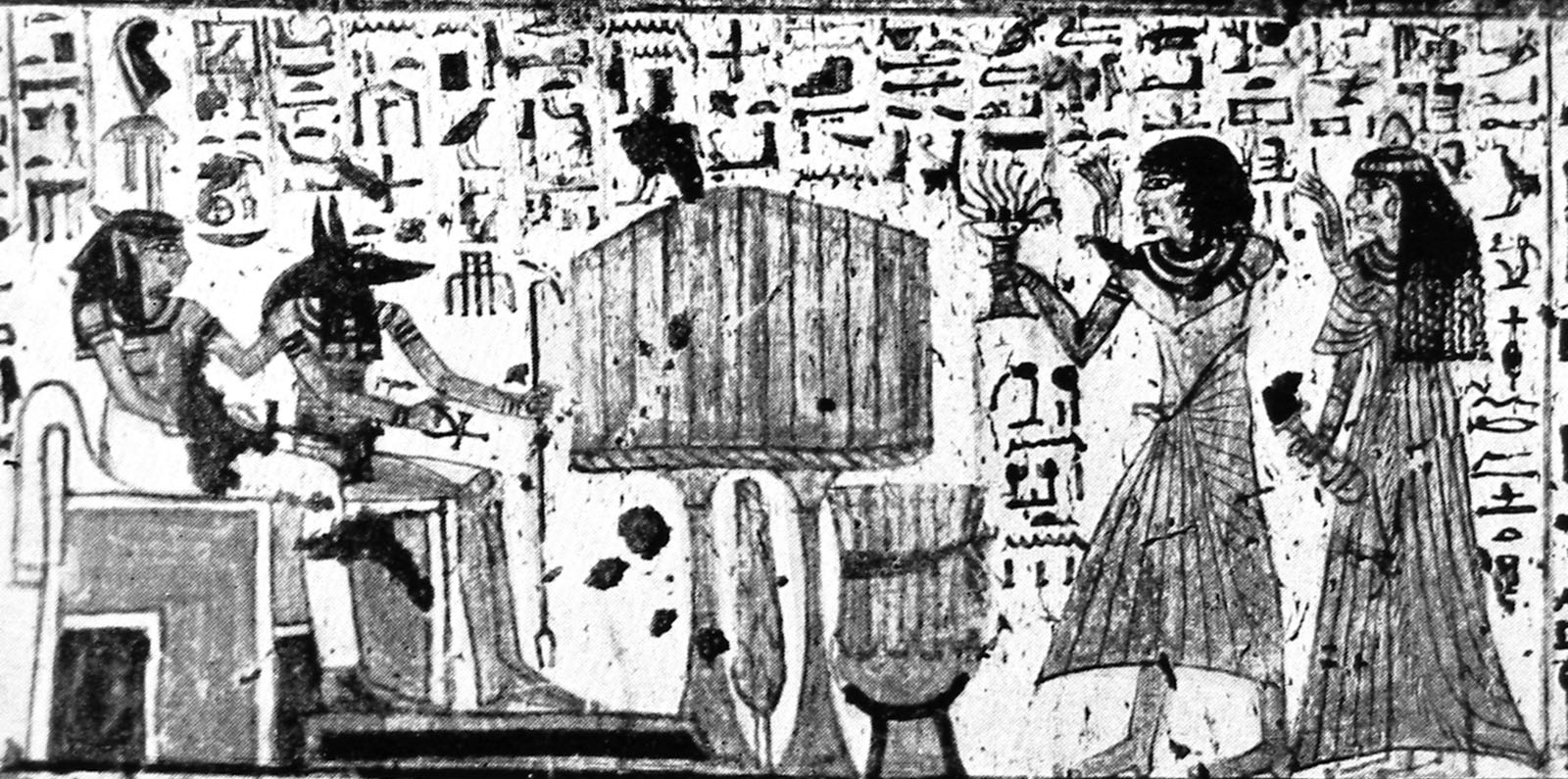 tt211_03_1786: TT211 Paneb – parede 3 Tímpano, emblema de Osiris no centro entre Anubis-chacal com morto e esposa de joelhos à esquerda e avô Kasa (TT010) e sua esposa de joelhos à direita. BRUYÈRE, Bernard. Tombes thébaines de Deir el-Medina à decoration monochrome. Le Caire. 1952. Mémoires de l'Institut Français d'Archéologie Orientale, LXXXVI [PL XXII]. |