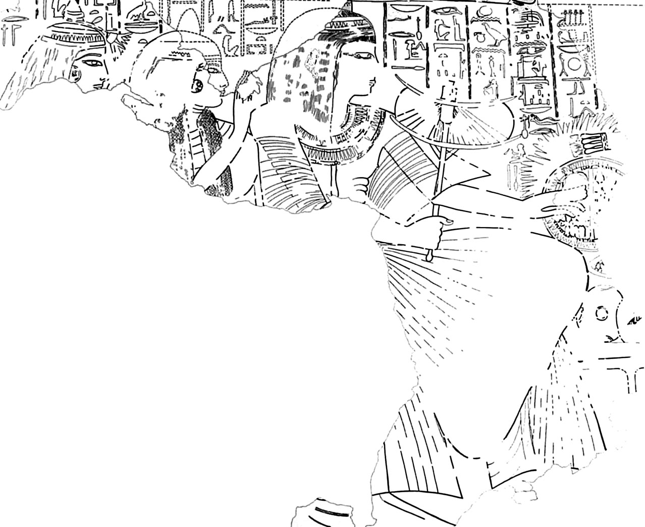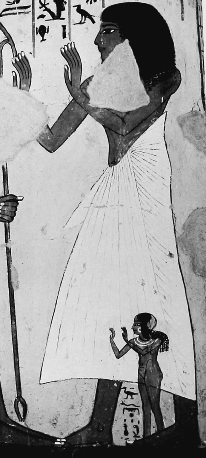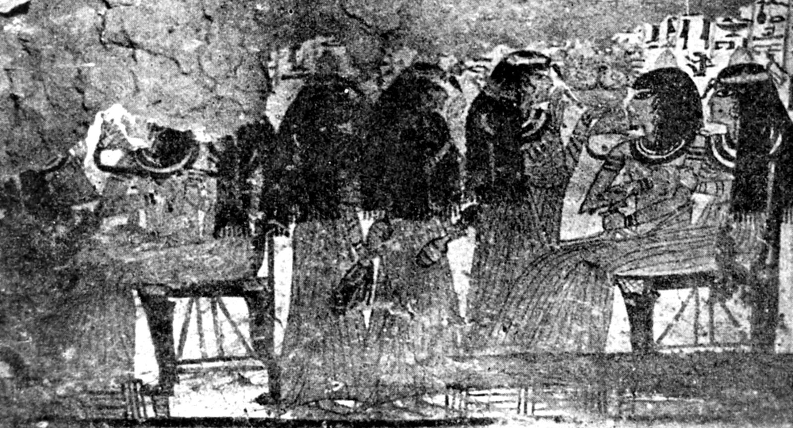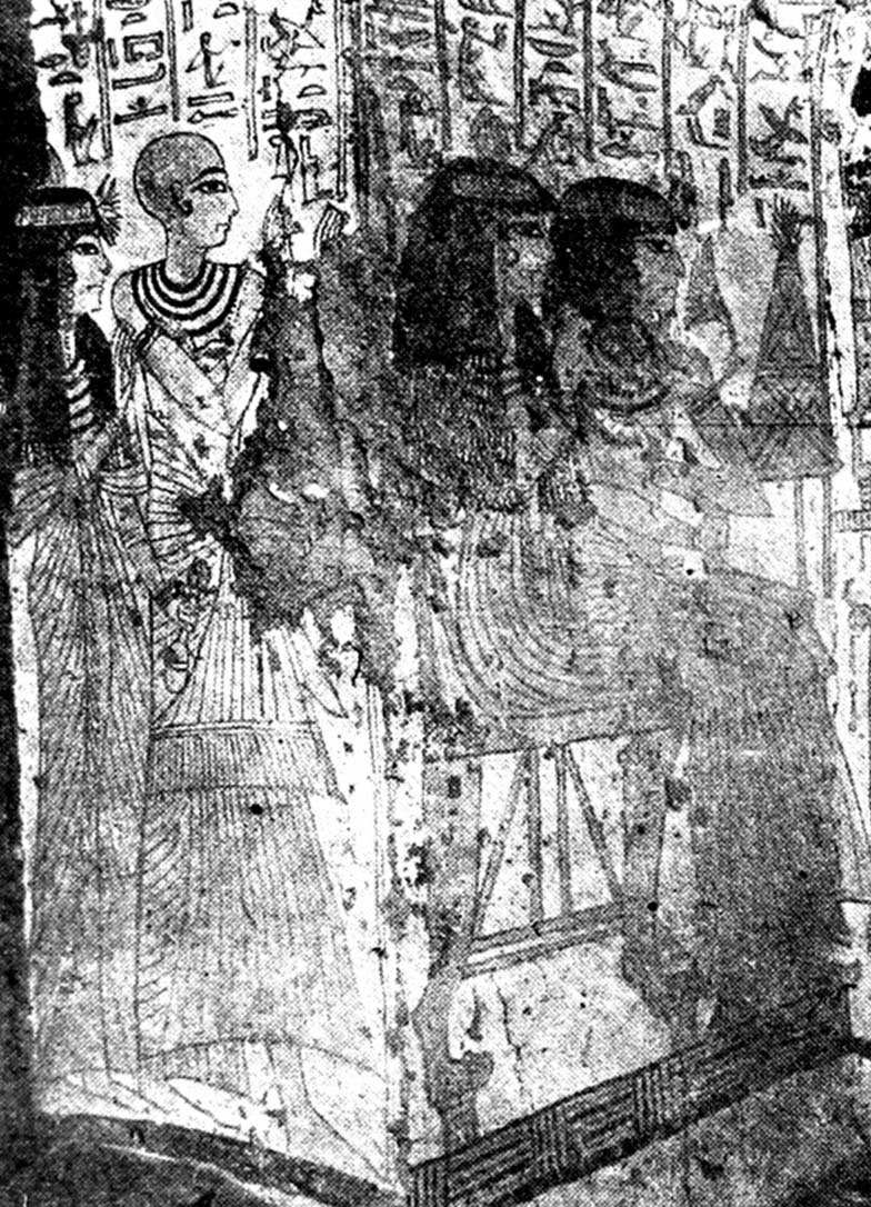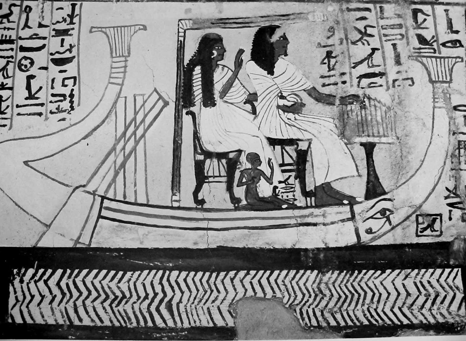 tt211_02_1777: TT211 Paneb – parede 2 [Morto] com seis filhas. BRUYÈRE, Bernard. Tombes thébaines de Deir el-Medina à decoration monochrome. Le Caire. 1952. Mémoires de l'Institut Français d'Archéologie Orientale, LXXXVI [PL XVI]. (detalhe) |