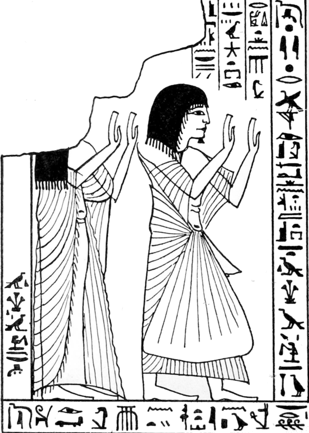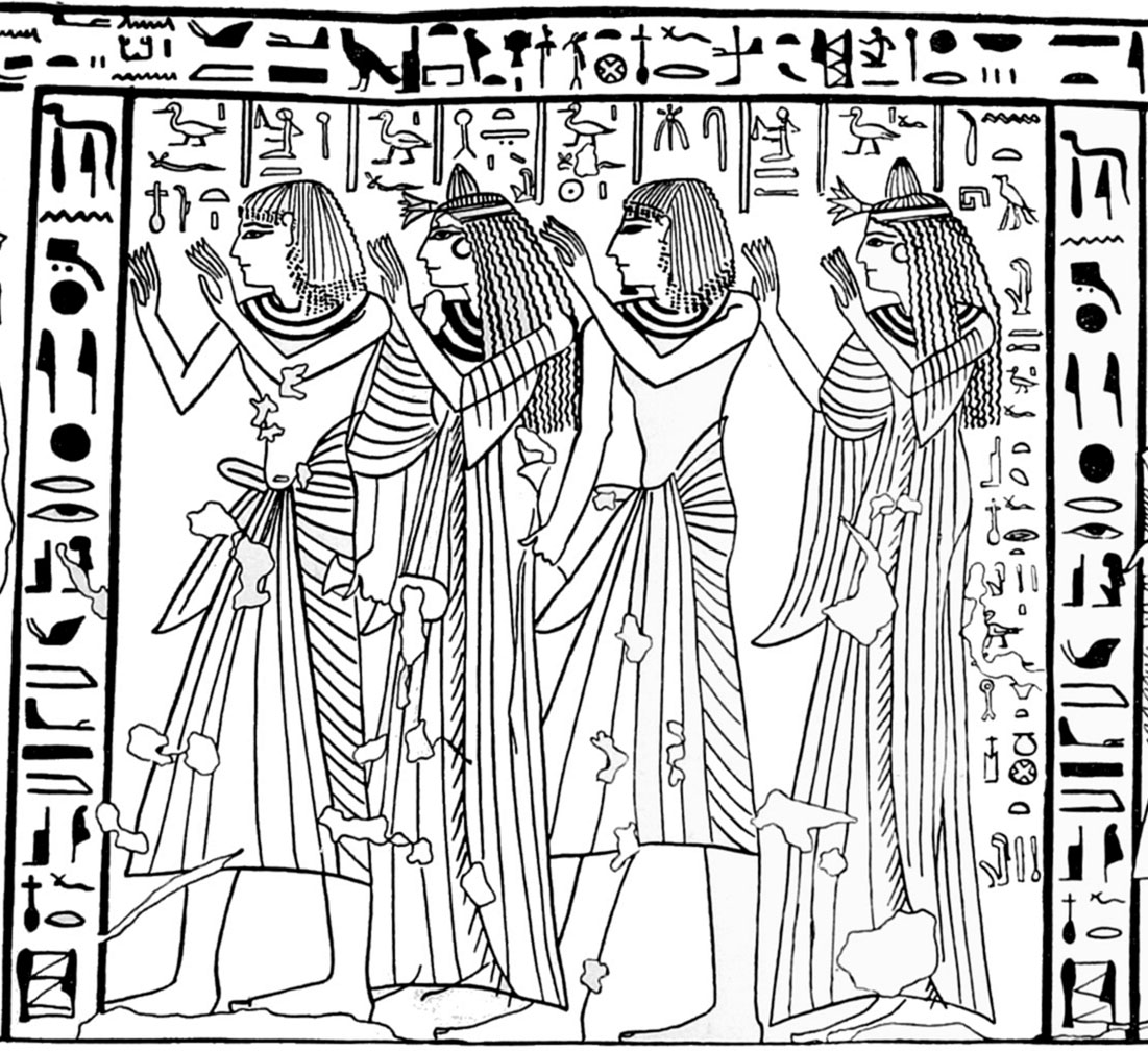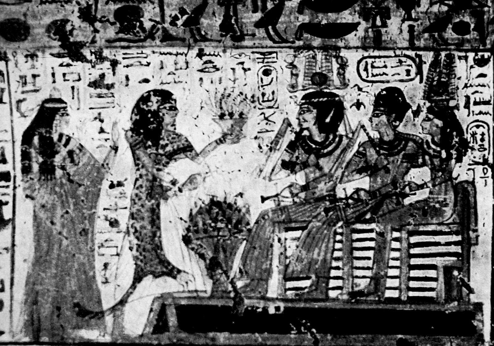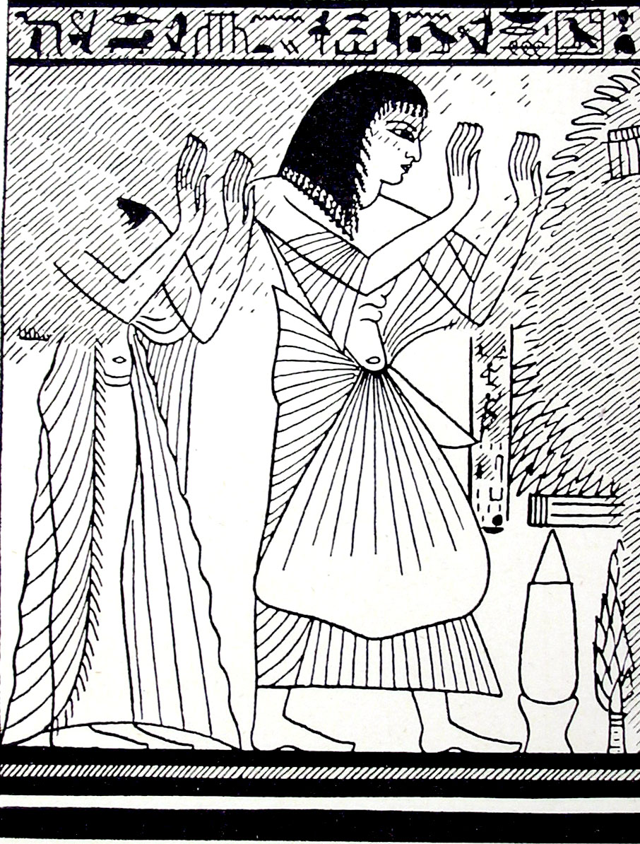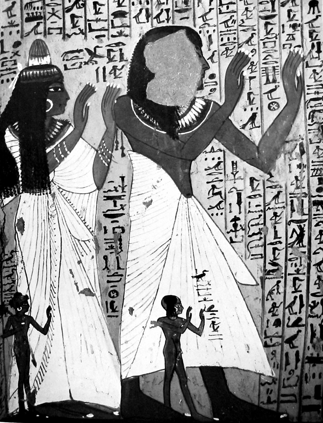 tt211_02_1777: TT211 Paneb – parede 2 [Morto] com seis filhas. BRUYÈRE, Bernard. Tombes thébaines de Deir el-Medina à decoration monochrome. Le Caire. 1952. Mémoires de l'Institut Français d'Archéologie Orientale, LXXXVI [PL XVI]. (detalhe) |