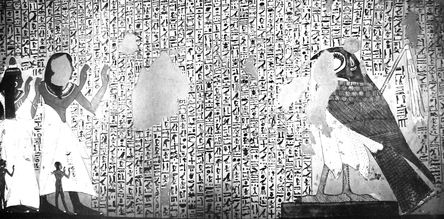 tt214_06b_1243: TT214 Khawi – parede 6, cena II – Morto e esposa adoram Harsiesi como falcão e uma cobra. BRUYÈRE, M. Bernard. "Rapport sur les fouilles de Deir el Médineh (1927)" IN: IFAO, Fouilles de L'Institut Français d'Archéologie Orientale du Caire Année 1927, tome 5ème, pt2. Le Caire: Imprimerie de L'Institut Français Orientale, 1928. [PL II]. |