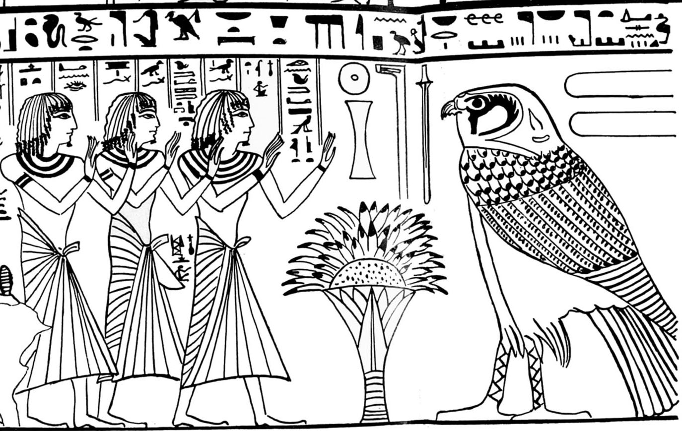 tt003_06_2952: TT003 Pashedu – parede 6 morto e família adoram Hórus como um falcão. ZIVIE, Alan-Pierre. La Tombe de Pached à Deir el-Médineh no.3. Le Caire: Imprimerie de L'Institut Français d'Archeologie Orientale, 1979. Mémoire Publiés par les membres de L'IFAO du Caire. Tome XCIX. [PL. 21] (detalhe) |