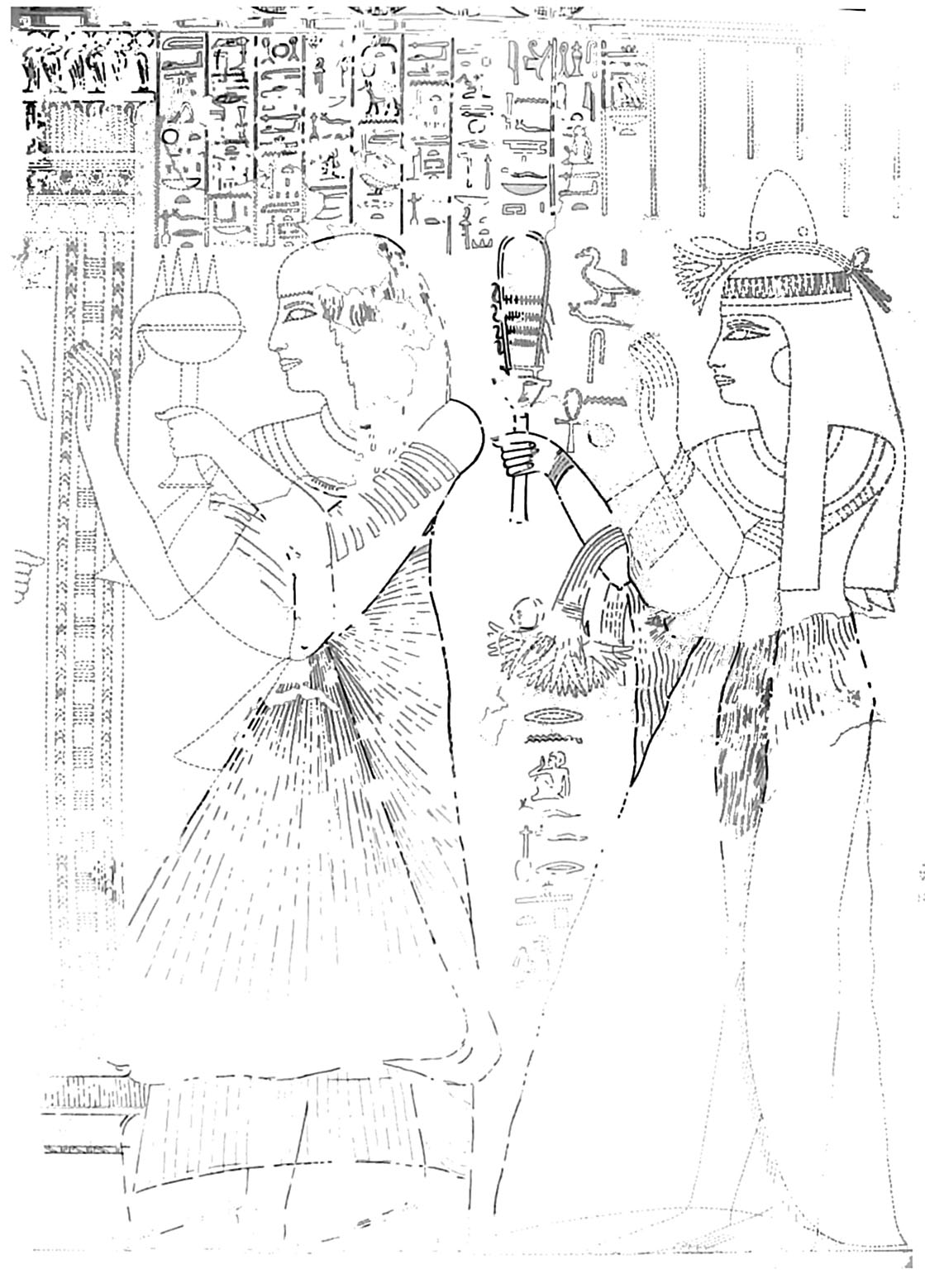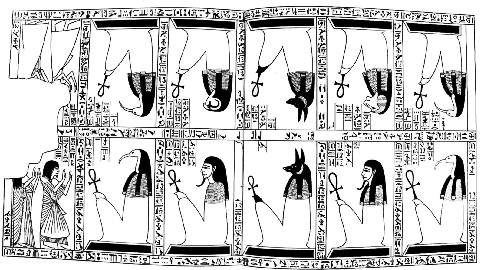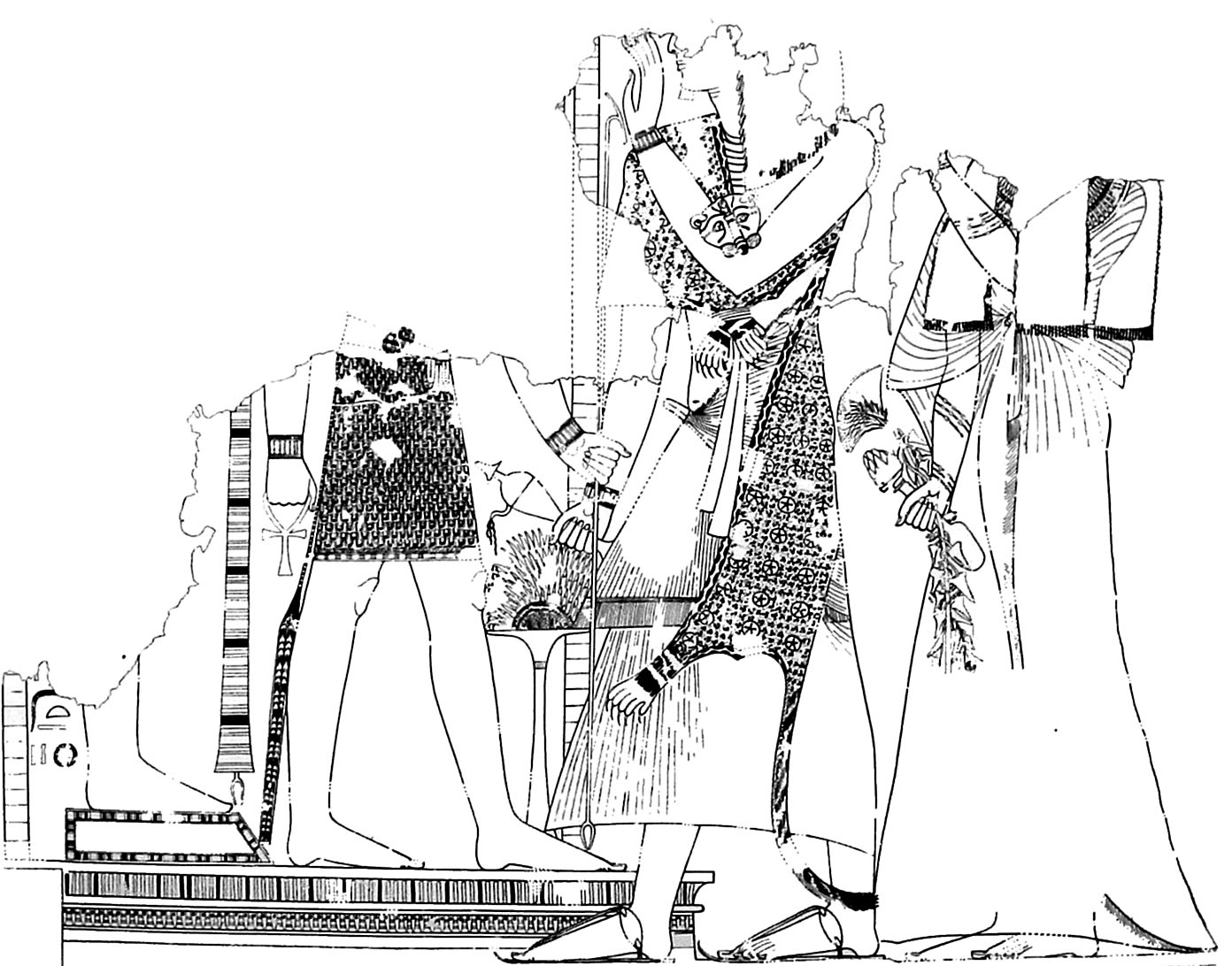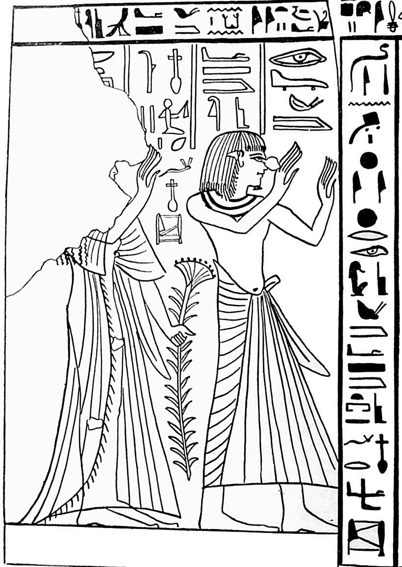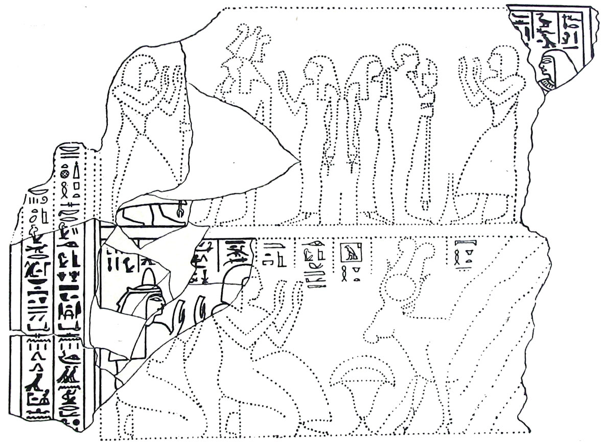 tt335_16_3271: TT335 Nekhtamun – parede 16, registros I e II. BRUYÈRE, M. Bernard. "Rapport sur les fouilles de Deir el Médineh (1924-1925)" IN: IFAO, Fouilles de L'Institut Français d'Archéologie Orientale du Caire Année 1924-1925, tome 3ème, pt2. Le Caire: Imprimerie de L'Institut Français Orientale, 1926. [P&ág. 129 Fig. 88] (detalhe) |