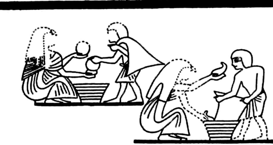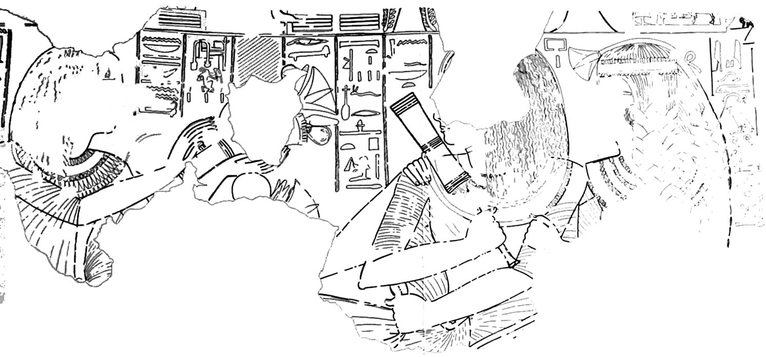 tt335_05_3256: TT335 Nekhtamun – parede 5 Três sacerdotes realizam a cerimonia de Abertura da Boca e purificam [o morto] e esposa. BRUYÈRE, M. Bernard. "Rapport sur les fouilles de Deir el Médineh (1924-1925)" IN: IFAO, Fouilles de L'Institut Français d'Archéologie Orientale du Caire Année 1924-1925, tome 3ème, pt2. Le Caire: Imprimerie de L'Institut Français Orientale, 1926. [P&ág. 119 Fig. 81]. |
