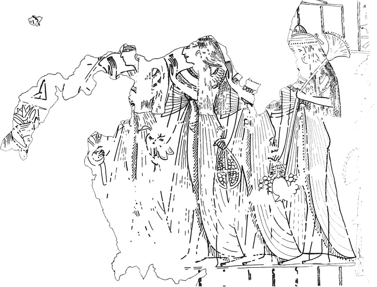 tt335_04_3258: TT335 Nekhtamun – parede 4 Filhas e filho fazem oferendas ao morto e família. BRUYÈRE, M. Bernard. "Rapport sur les fouilles de Deir el Médineh (1924-1925)" IN: IFAO, Fouilles de L'Institut Français d'Archéologie Orientale du Caire Année 1924-1925, tome 3ème, pt2. Le Caire: Imprimerie de L'Institut Français Orientale, 1926. [P&ág. 120 Fig. 82]. |