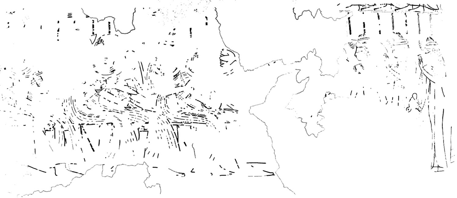 tt215_02c_0402: TT215 Amenemopet – parede 2, registro III, detalhe Restos de cena da esposa tocando musica e cantando diante do morto debaixo de uma palmeira. JOURDAIN, G. "La tombe du scribe royal Amenemopet", in VANDIER d'ABBADIE, Mme Jeanne. Deux tombes de Deir el-Médineh. Le Caire: Imprimerie de l'Institut Français d'Archéologie Orientale, 1939. (Memoires 73) [PL XXIV]. |