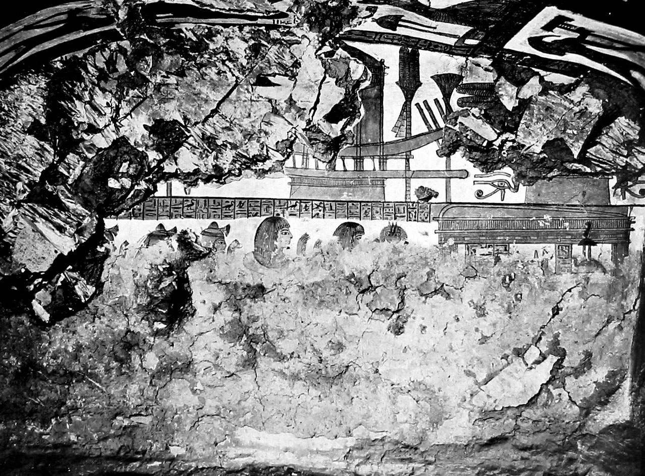 tt360_04b_1671: TT360 Kaha (Qaha) – parede 4, registro II Peregrinação à Abidos com morto, esposa e filho num barco chegando na montanha. BRUYÈRE, M. Bernard. "Rapport sur les fouilles de Deir el Médineh (1930)" IN: IFAO, Fouilles de L'Institut Français d'Archéologie Orientale du Caire Année 1930, tome 8ème, pt3. Le Caire: Imprimerie de L'Institut Français Orientale, 1933. [PL XXVI]. |