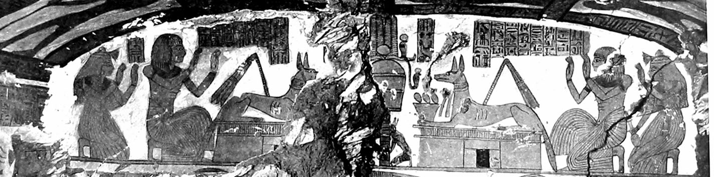 tt211_01_1794: TT211 Paneb – parede 1 Morto com o filho e as filhas adoram [Anubis e Hathor do Oeste]. BRUYÈRE, Bernard. Tombes thébaines de Deir el-Medina à decoration monochrome. Le Caire. 1952. Mémoires de l'Institut Français d'Archéologie Orientale, LXXXVI [PL XXV]. |