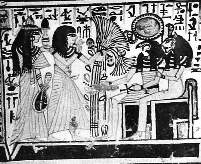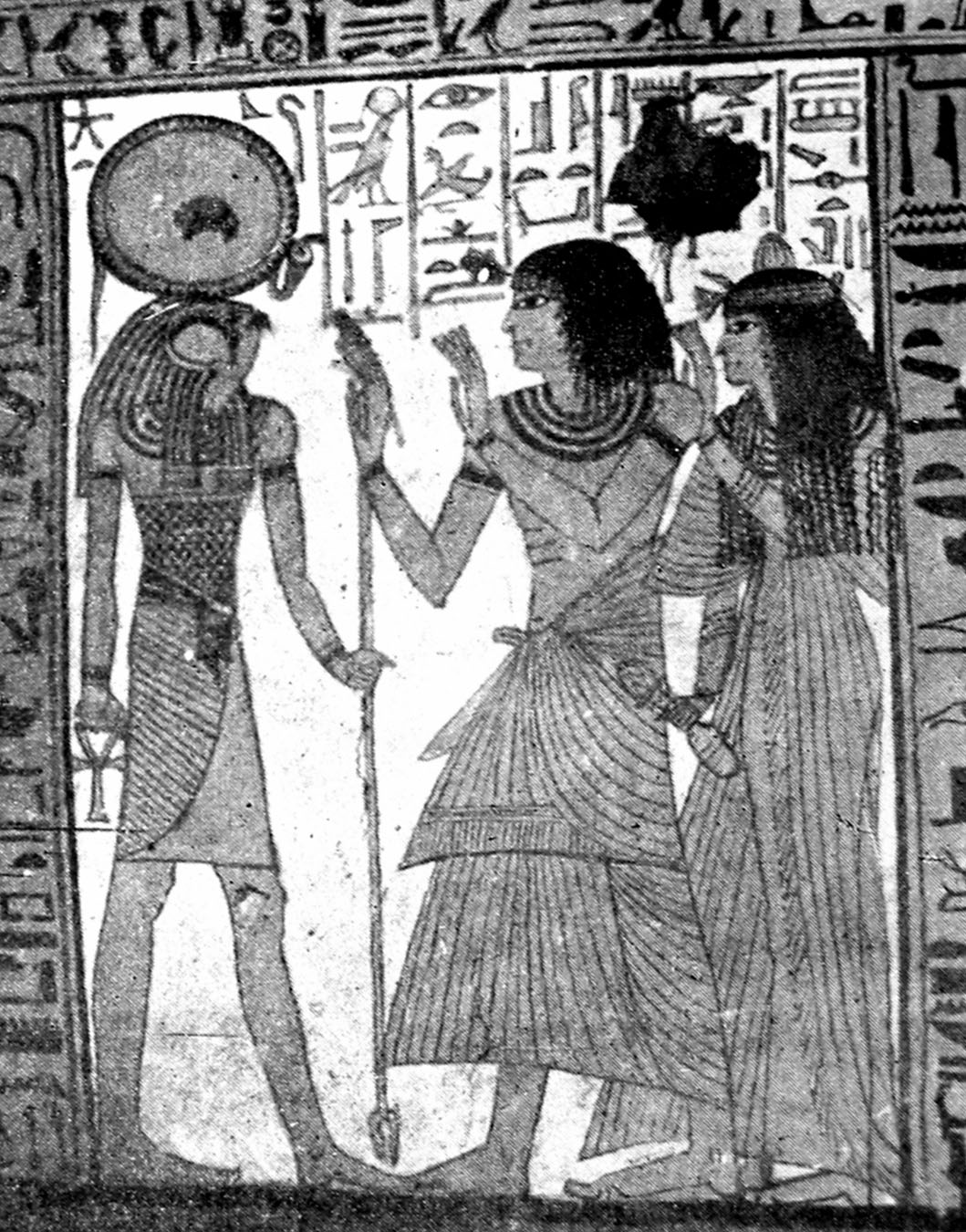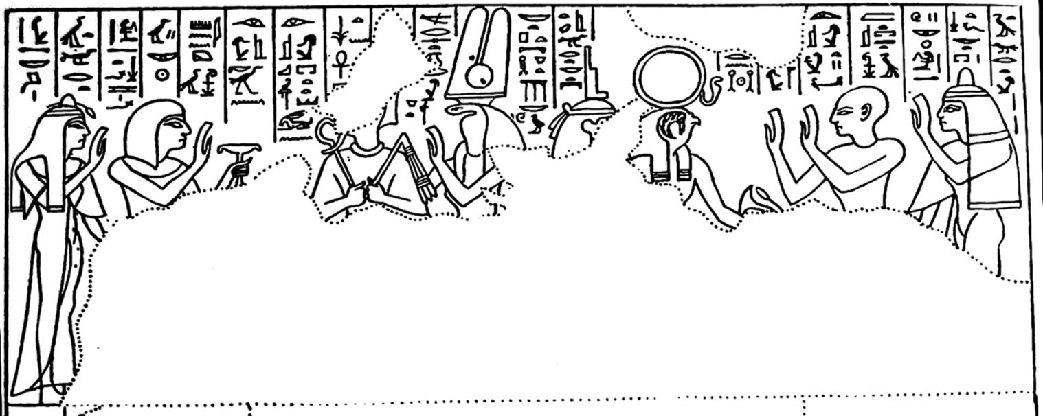 tt335_26d_3290: TT335 Nekhtamun – parede 26, cena 4 Morto e esposa adoram R&á-Harakhti. BRUYÈRE, M. Bernard. "Rapport sur les fouilles de Deir el Médineh (1924-1925)" IN: IFAO, Fouilles de L'Institut Français d'Archéologie Orientale du Caire Année 1924-1925, tome 3ème, pt2. Le Caire: Imprimerie de L'Institut Français Orientale, 1926. [P&ág.156 Fig. 104]. |