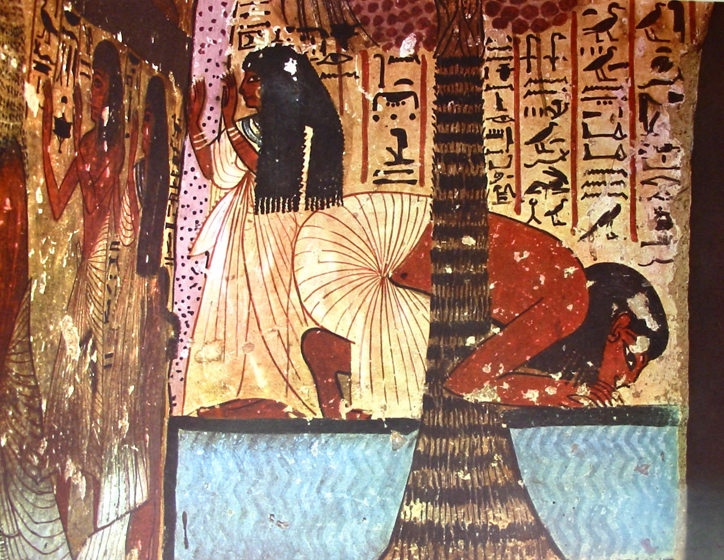 tt218_07-09b_5136: TT218 Amennakht – parede 7 abaixo e 9 registro II 7) Morto curvado debaixo de uma palmeira bebe de uma piscina, e esposa adorando pertencendo à 9) II Morto de joelhos com família e hinos à R&á ). VANDIER, Jacques. Egypt. Paintings from tombs and Temples. Published by the New York Graphic Society by arrangement with UNESCO. Copyright 1954, Paris, France by United Nations Educational Scientificand Cultural Organizarion. [PL. V]. |
