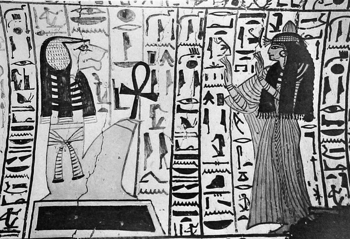 tt002_19_5776: TT002 Khabekhnet – parede 19. Morto e esposa ajoelhados oferecendo "uzat" à Thot como um babuíno. http://www.osirisnet.net/tombes/artisans/khabe/photo/khab_8.jpg. BENDERITTER, Thierry (org.). http://www.osiris.net & LIVET, Jacques. Tombes et Mastabas de l'Ancienne Égypte. Paris: Jacques Livet Ed., s/d. (cena em cor) |