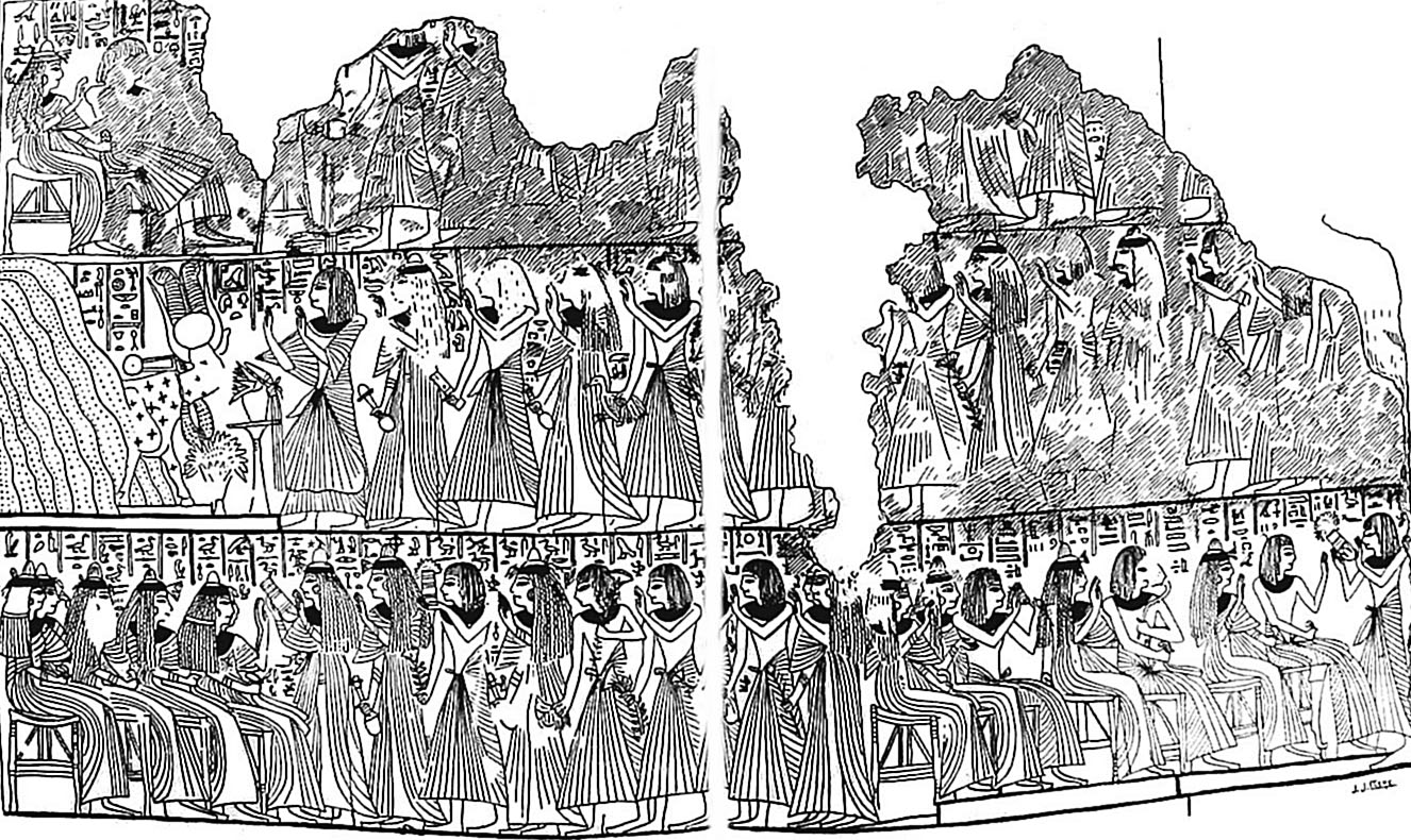 tt336_07bc_3243: TT336 Neferronpet – parede 7 registros II e III Banquete com morto e parentes. BRUYÈRE, M. Bernard. "Rapport sur les fouilles de Deir el Médineh (1924-1925)" IN: IFAO, Fouilles de L'Institut Français d'Archéologie Orientale du Caire Année 1924-1925, tome 3ème, pt2. Le Caire: Imprimerie de L'Institut Français Orientale, 1926. [P&ág. 89 Fig. 59]. |