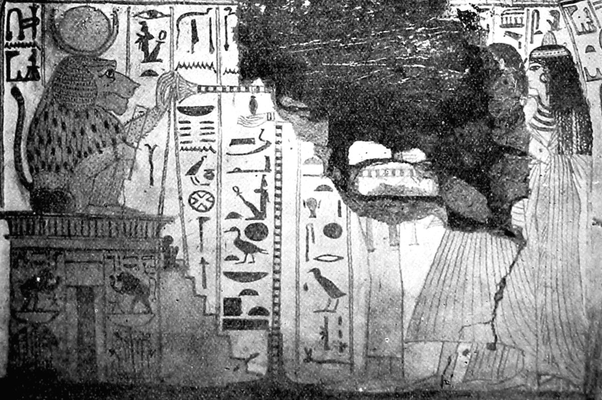 tt002_24c_1762: TT002 Khabekhnet – parede 24, cena III. Morto e esposa diante de Ptah-Sokari e Tefnut. BRUYÈRE, Bernard. Tombes thébaines de Deir el-Medina à decoration monochrome. Le Caire. 1952. Mémoires de l'Institut Français d'Archéologie Orientale, LXXXVI. [PL IX] |