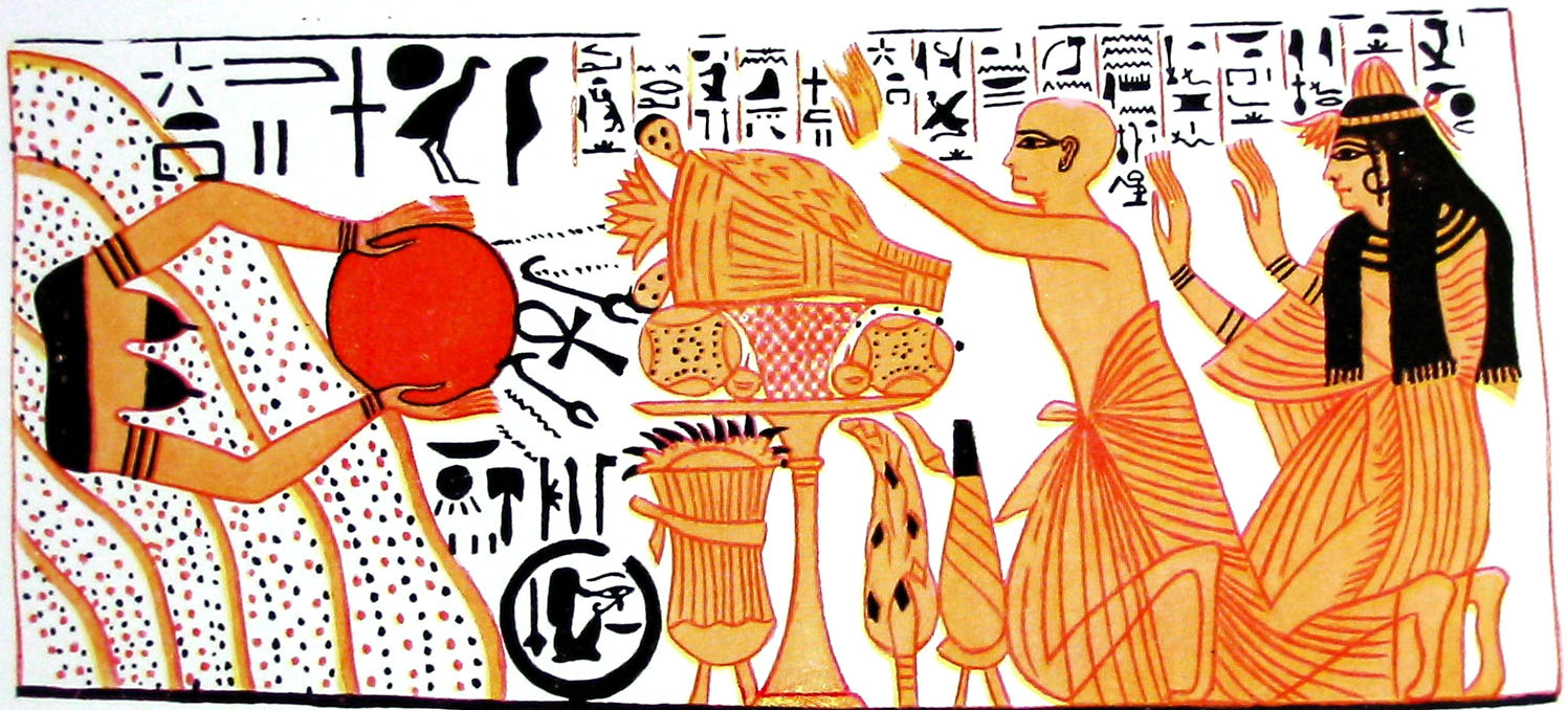 tt001_07_4875: TT001 Sennedjem – parede 07. Morto e esposa adoram os deuses do submundo. SHEDID, Abdel Ghaffar. Das Grab des Sennedjem: ein Kunstlergrab de 19. Dynastie in Deir el Medineh. Mainz am Rhein: Verlag Philipp von Zabern, 1994.(detalhe do casal em cor) |