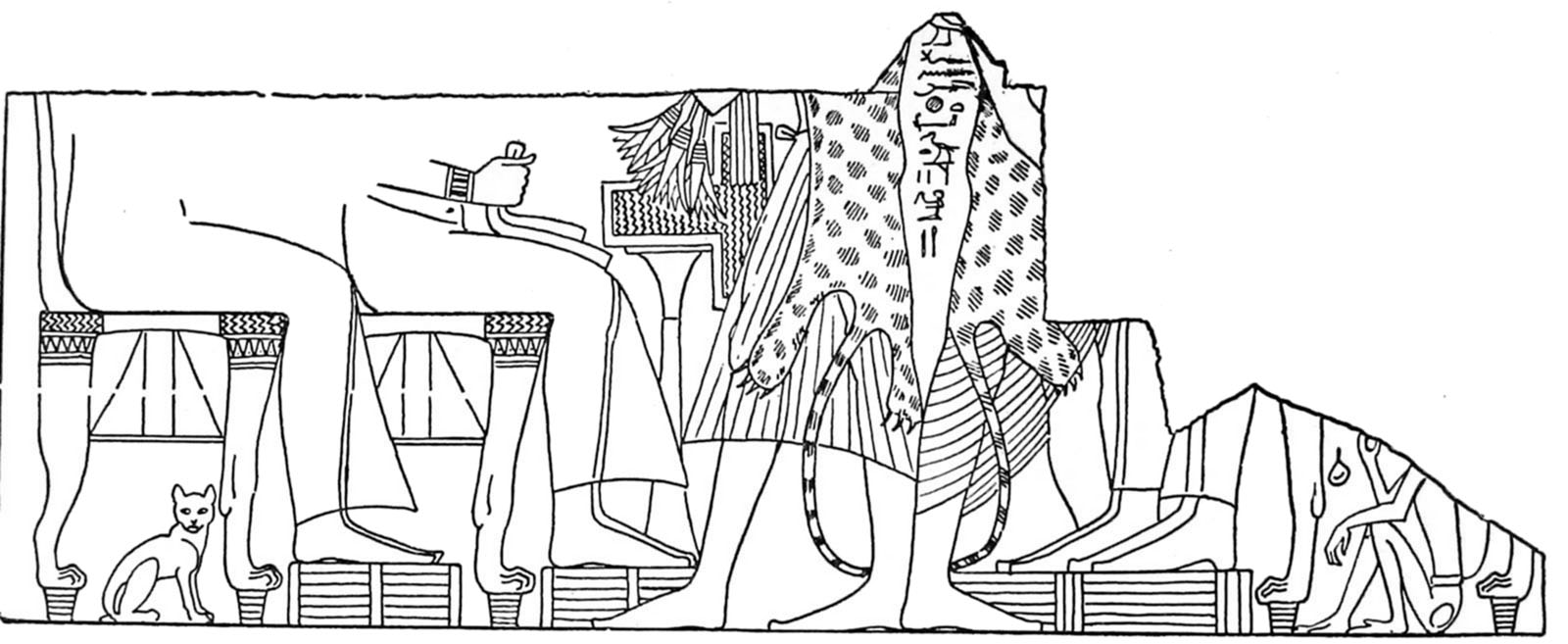 tt357_02_1433: TT357 Dhutihirnaktuf – parede 2 Parede direita cena dupla, filho como um sacerdote faz oferendas ao [morto e esposa] com gato debaixo da cadeira na metade esquerda, e macaco comendo figos na metade direita. BRUYÈRE, M. Bernard. "Rapport sur les fouilles de Deir el Médineh (1929)" IN: IFAO, Fouilles de L'Institut Français d'Archéologie Orientale du Caire Année 1929, tome 7ème, pt2. Le Caire: Imprimerie de L'Institut Français Orientale, 1930. [P&ág. 72 Fig. 31]. |