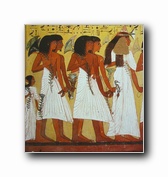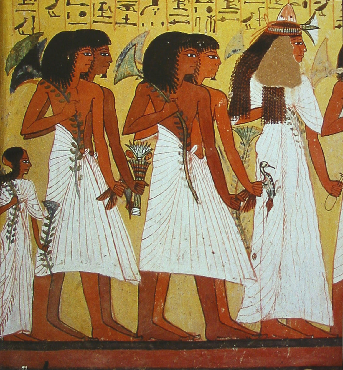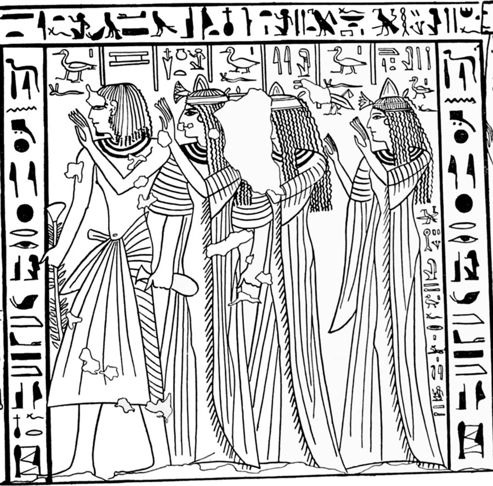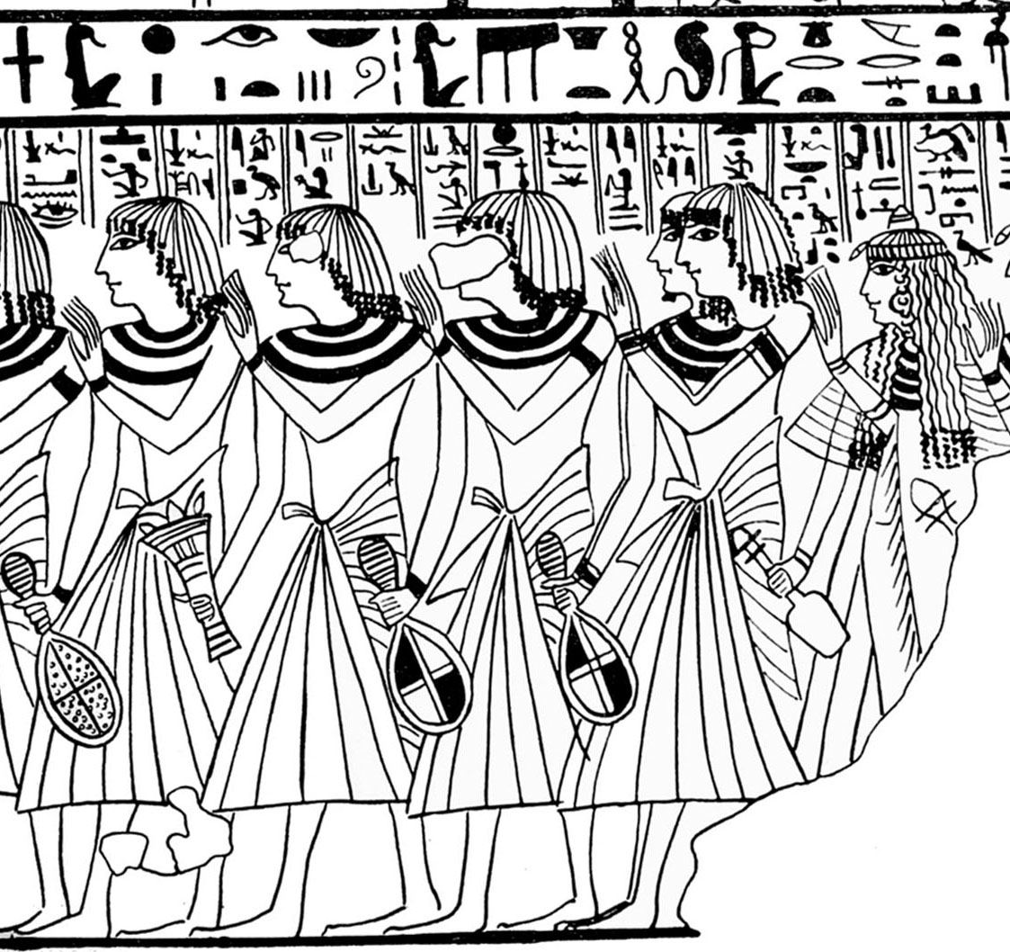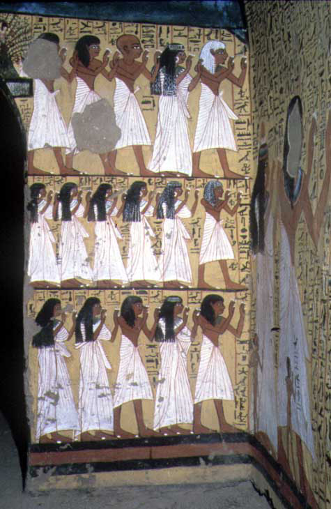 tt006_nib_0336: TT006 Neferhotepe & Nebnefer – parede não identificada Parede Leste parte superior. Casal sentado recebe homenagem de quatro homens e quatro mulheres (somente as mulheres foram consevadas). WILD, Henri. La tombe de Nefer hotep (I) et Neb Nefer à Deir el-Médîna (n. 6) et autres document les concernant II. Le Caire: Institut Français d'Archéologie Orientale, 1979 (Mémoires 103/2) [PL 7] (detalhe das moças) |