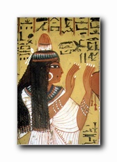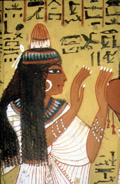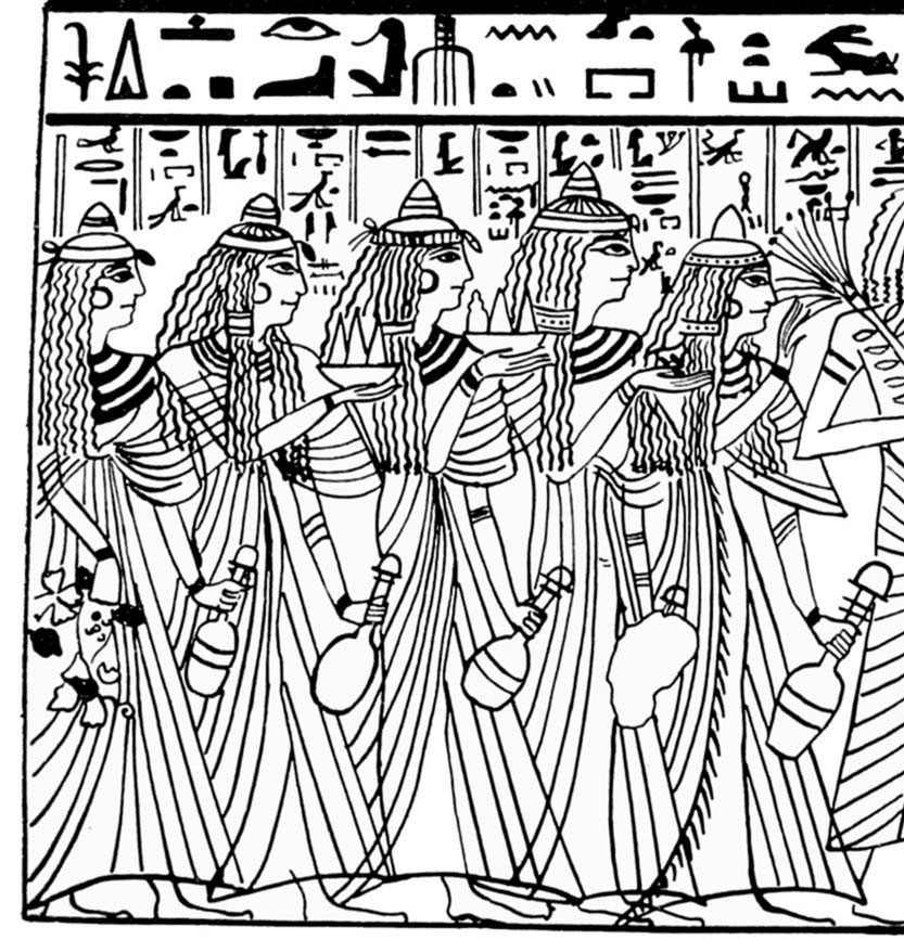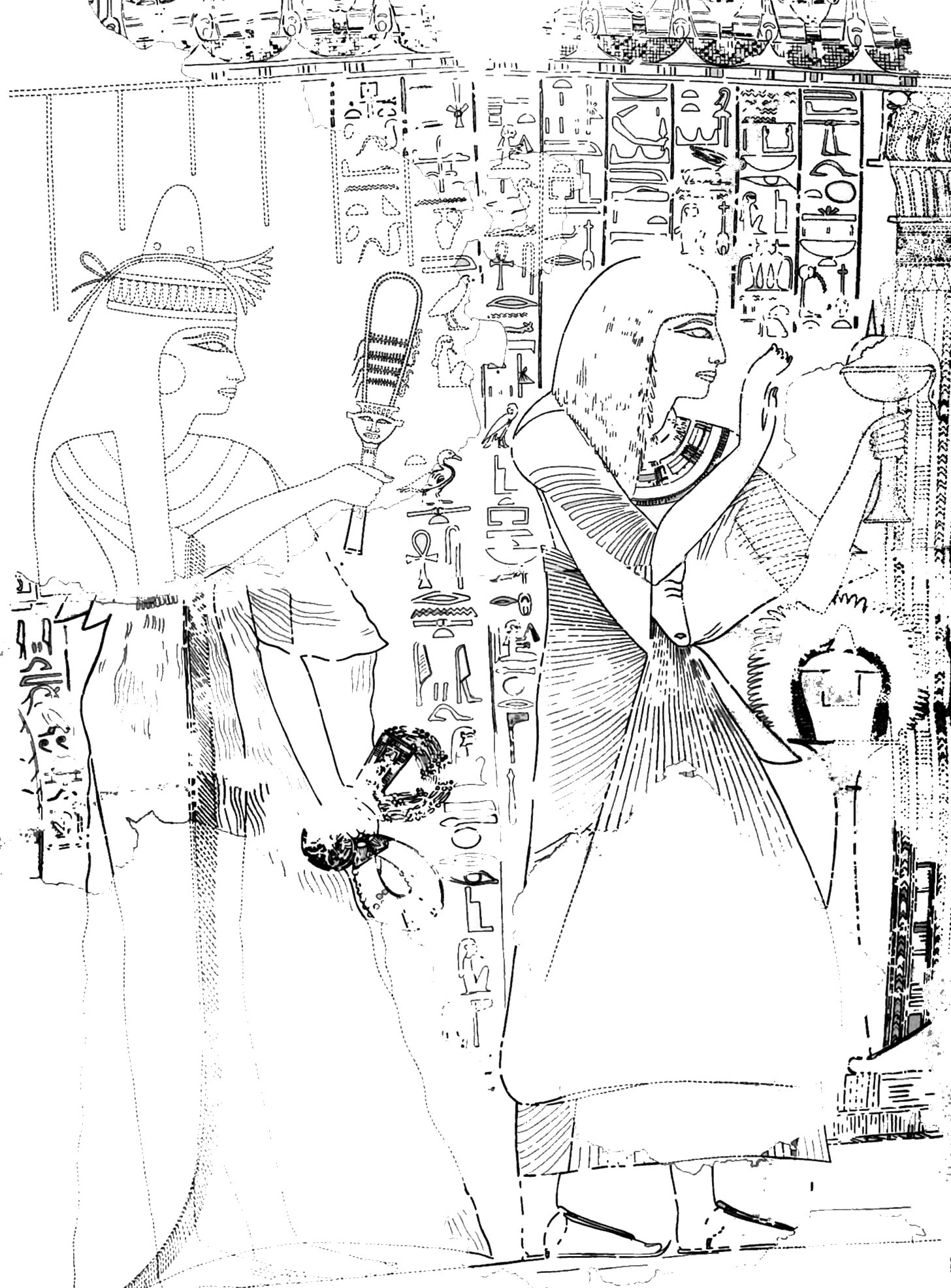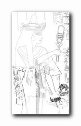 tt335_22b_5791: TT335 Nekhtamun – parede 22, cena 2 Esposa do filho com sistro diante de Maat. http://www.osirisnet.net/tombes/artisans/nakht335/photo/nak335_37.jpg BENDERITTER, Thierry (org.). http://www.osiris.net & LIVET, Jacques. Tombes et Mastabas de l'Ancienne Égypte. Paris: Jacques Livet Ed., s/d. (detalhe de cena em cor) |