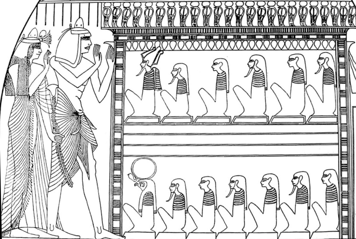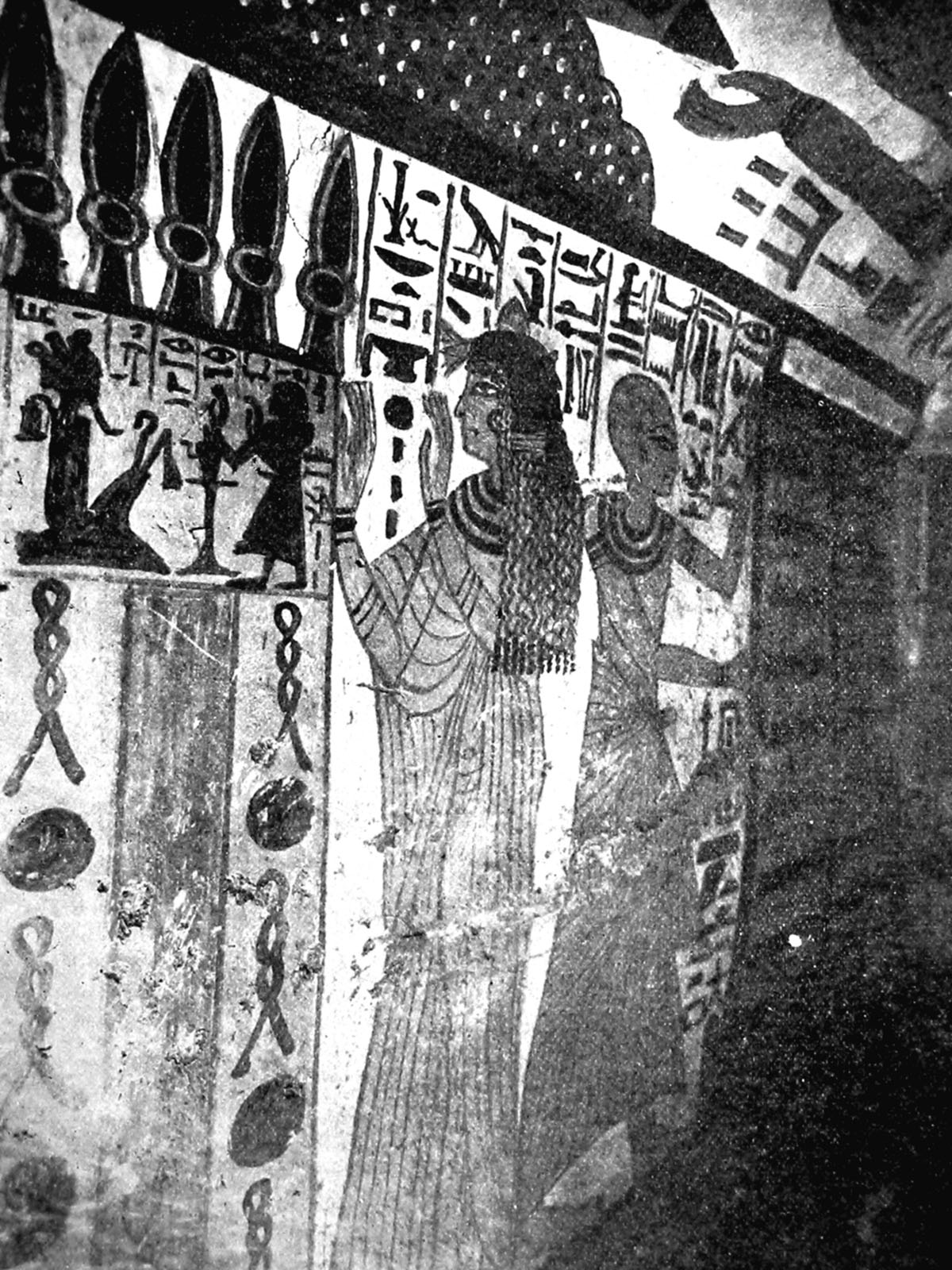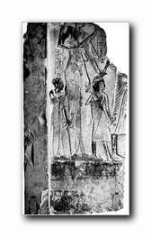 tt335_20_3281: TT335 Nekhtamun – parede 20 Morto e esposa (de costas um para o outro) abrem portões do mundo dos mortos e da eternidade respectivamente. BRUYÈRE, M. Bernard. "Rapport sur les fouilles de Deir el Médineh (1924-1925)" IN: IFAO, Fouilles de L'Institut Français d'Archéologie Orientale du Caire Année 1924-1925, tome 3ème, pt2. Le Caire: Imprimerie de L'Institut Français Orientale, 1926. [P&ág. 143 Fig. 94]. |