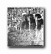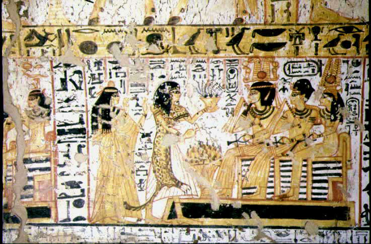 tt001_05I_4857: TT001 Sennedjem – parede 05 face externa – cena I. Falecido esposa e uma mulher diante de Osíres e Maat. SHEDID, Abdel Ghaffar. Das Grab des Sennedjem: ein Kunstlergrab de 19. Dynastie in Deir el Medineh. Mainz am Rhein: Verlag Philipp von Zabern, 1994. |