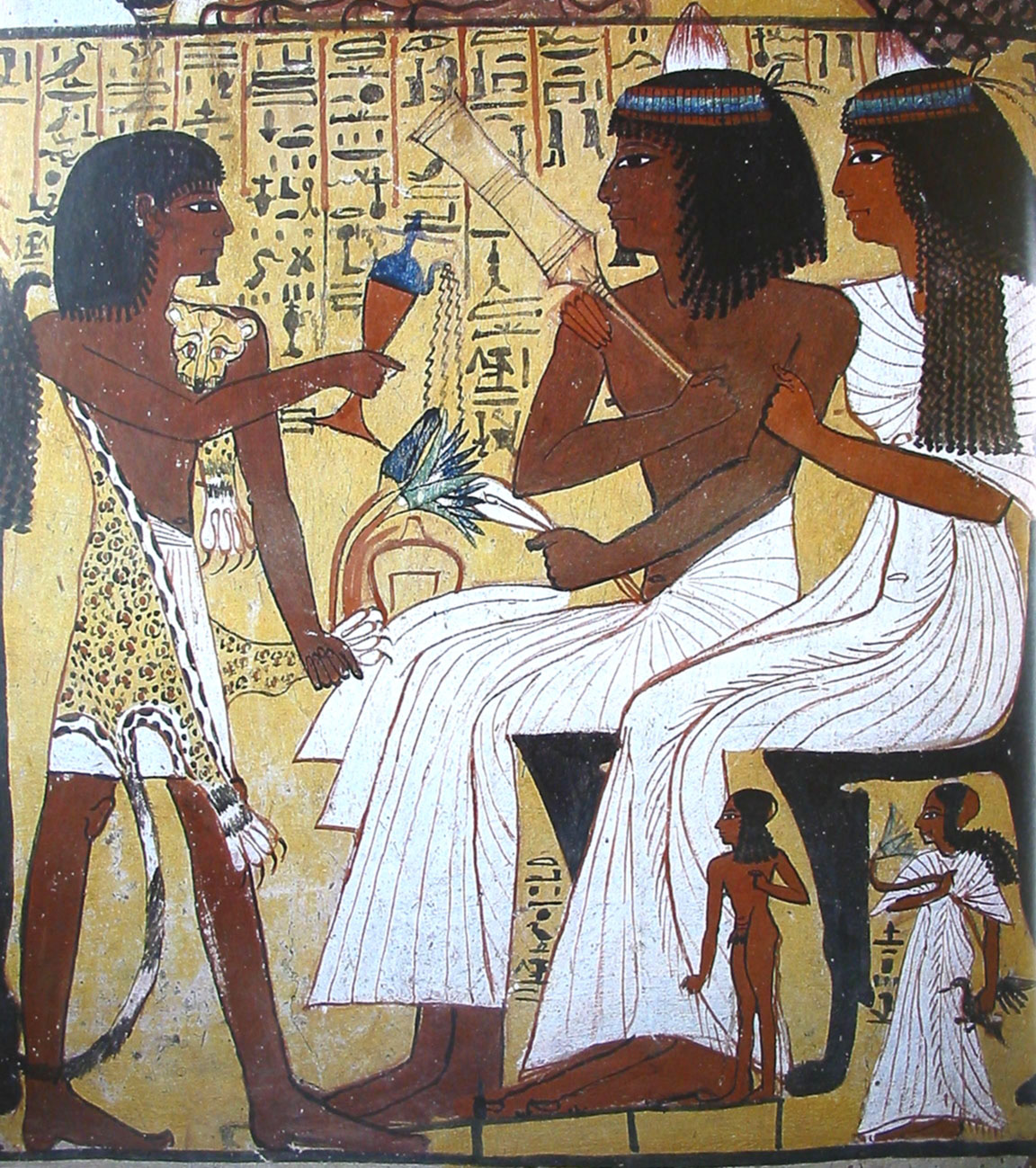 tt006_10b_0346: TT006 Neferhotepe & Nebnefer – parede 10 Norte, registro inferior: Nebnefer, sua esposa e a mãe de sua esposa, Iset participam de um banquete oferecido por v&ários casais (apenas um aparece nessa parede, os outros ocupam o registro inferior da parede leste) - detalhe do trio. WILD, Henri. La tombe de Nefer hotep (I) et Neb Nefer à Deir el-Médîna (n. 6) et autres document les concernant II. Le Caire: Institut Français d'Archéologie Orientale, 1979 (Mémoires 103/2) [PL 12] |