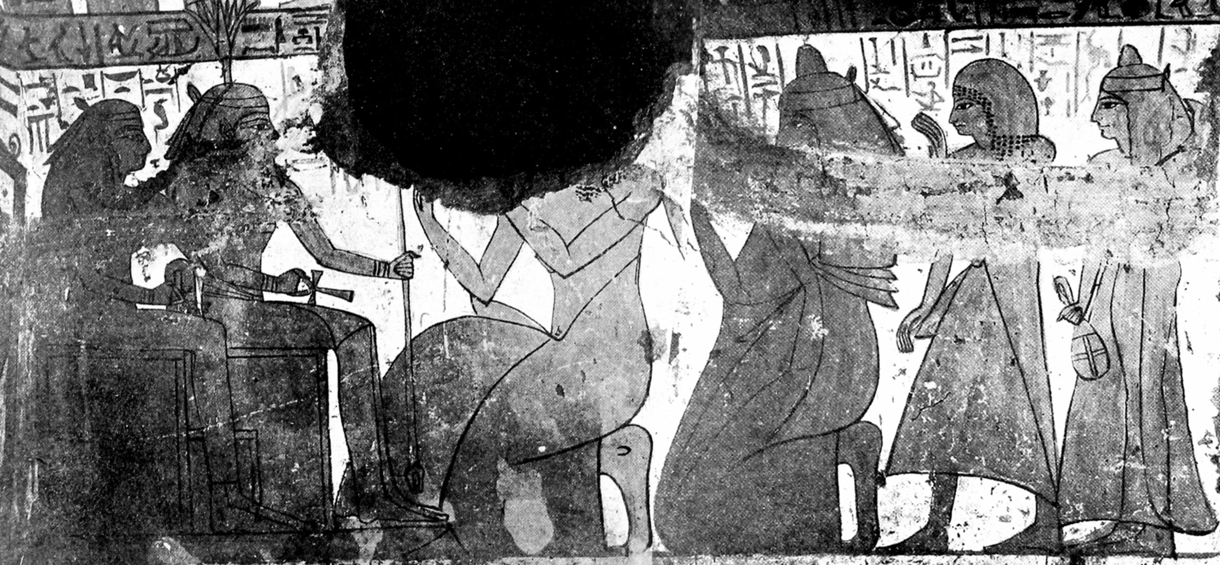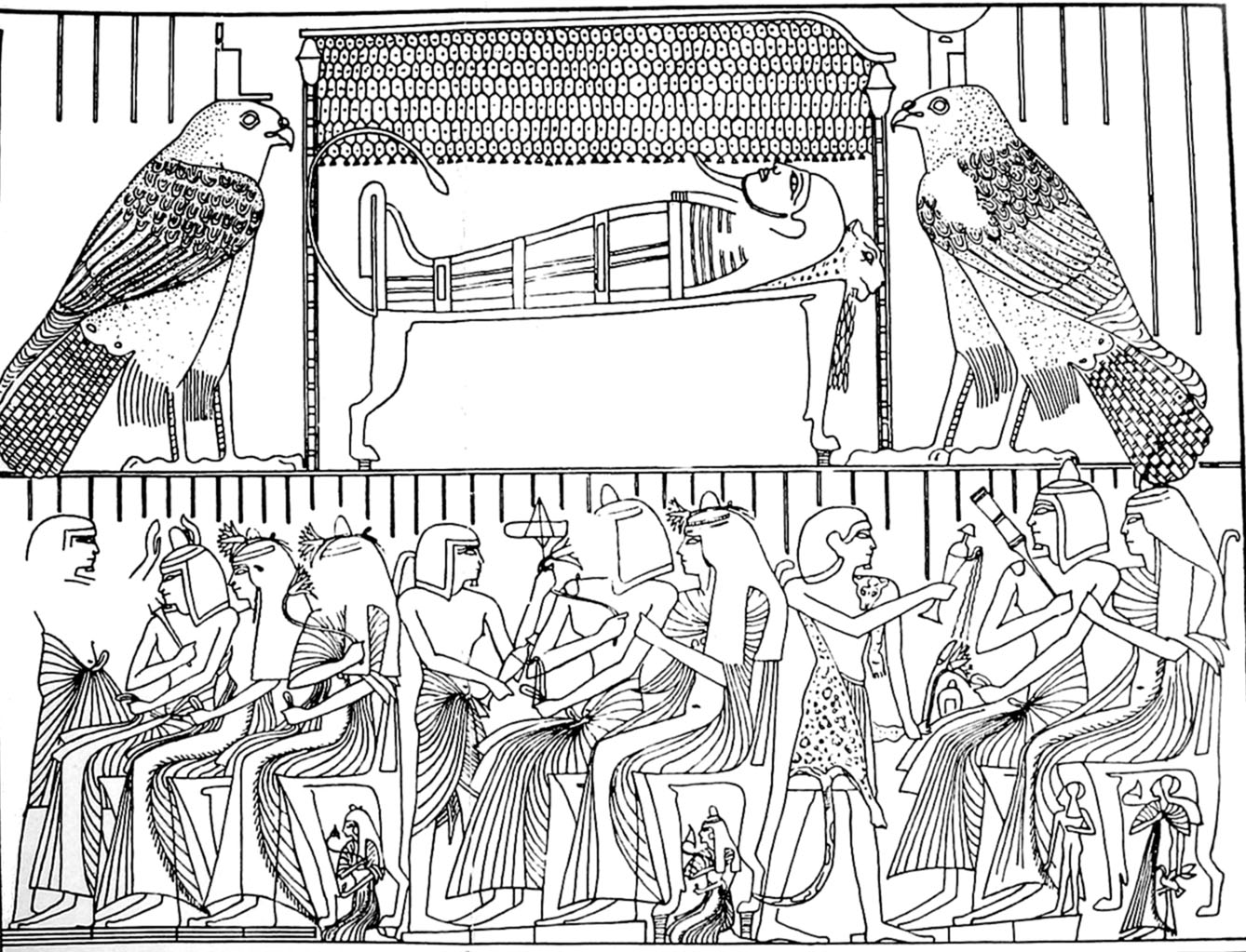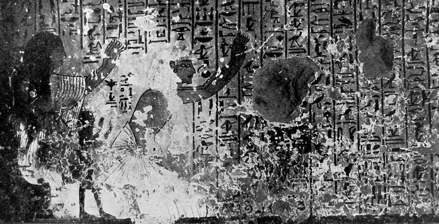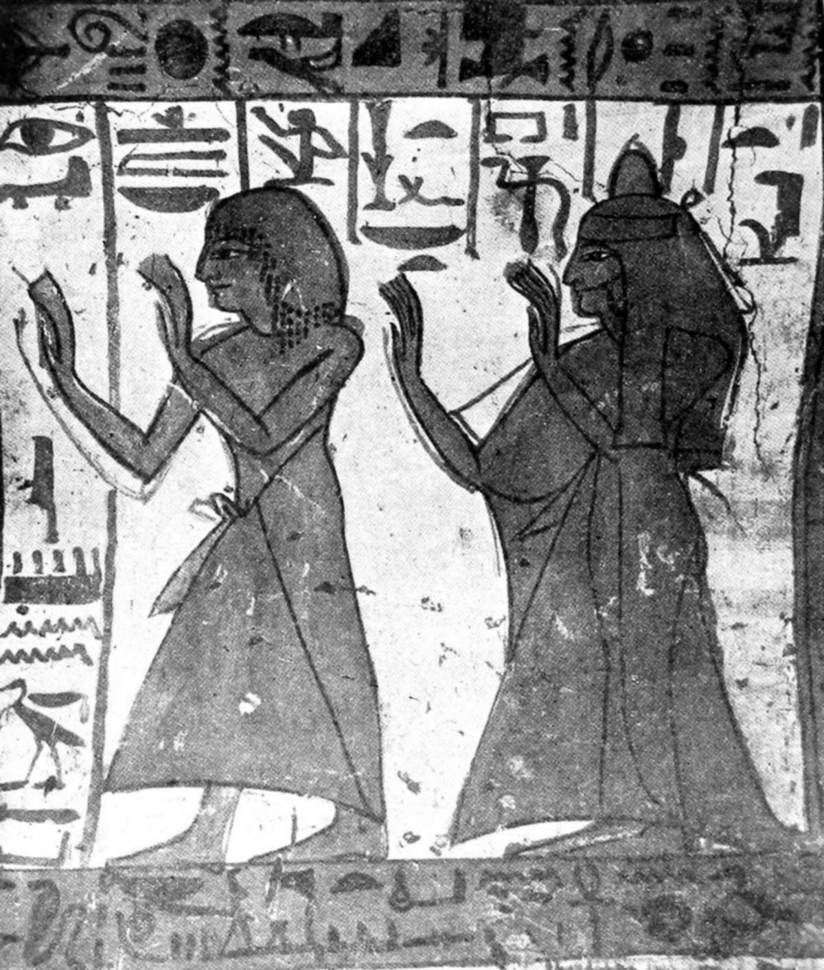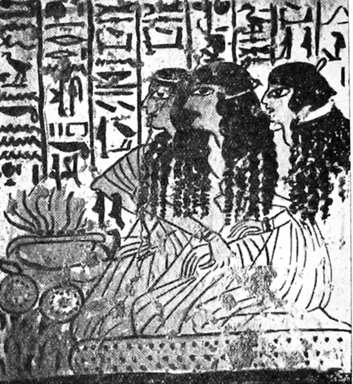 tt211_02_1777: TT211 Paneb – parede 2 [Morto] com seis filhas. BRUYÈRE, Bernard. Tombes thébaines de Deir el-Medina à decoration monochrome. Le Caire. 1952. Mémoires de l'Institut Français d'Archéologie Orientale, LXXXVI [PL XVI]. (detalhe) |