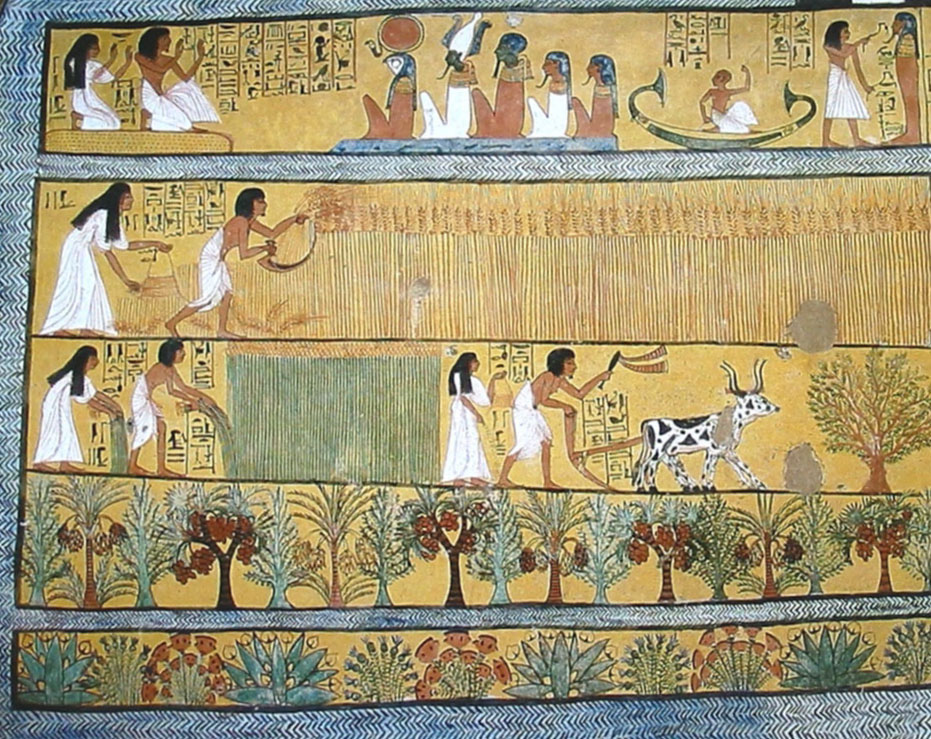 tt001_09_4887: TT001 Sennedjem – parede 09. Campos de Iaru – Plantio. SHEDID, Abdel Ghaffar. Das Grab des Sennedjem: ein Kunstlergrab de 19. Dynastie in Deir el Medineh. Mainz am Rhein: Verlag Philipp von Zabern, 1994. (Detalhe em cor) |