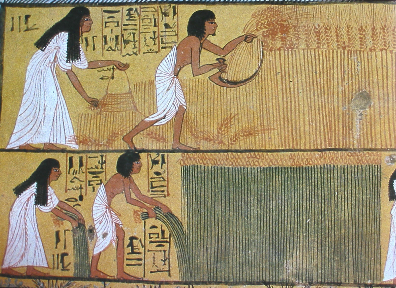 tt001_09_4886: TT001 Sennedjem – parede 09. Os campos de Iaru - colheita do trigo e arrancamento do linho. SHEDID, Abdel Ghaffar. Das Grab des Sennedjem: ein Kunstlergrab de 19. Dynastie in Deir el Medineh. Mainz am Rhein: Verlag Philipp von Zabern, 1994. (Detalhe em cor) |