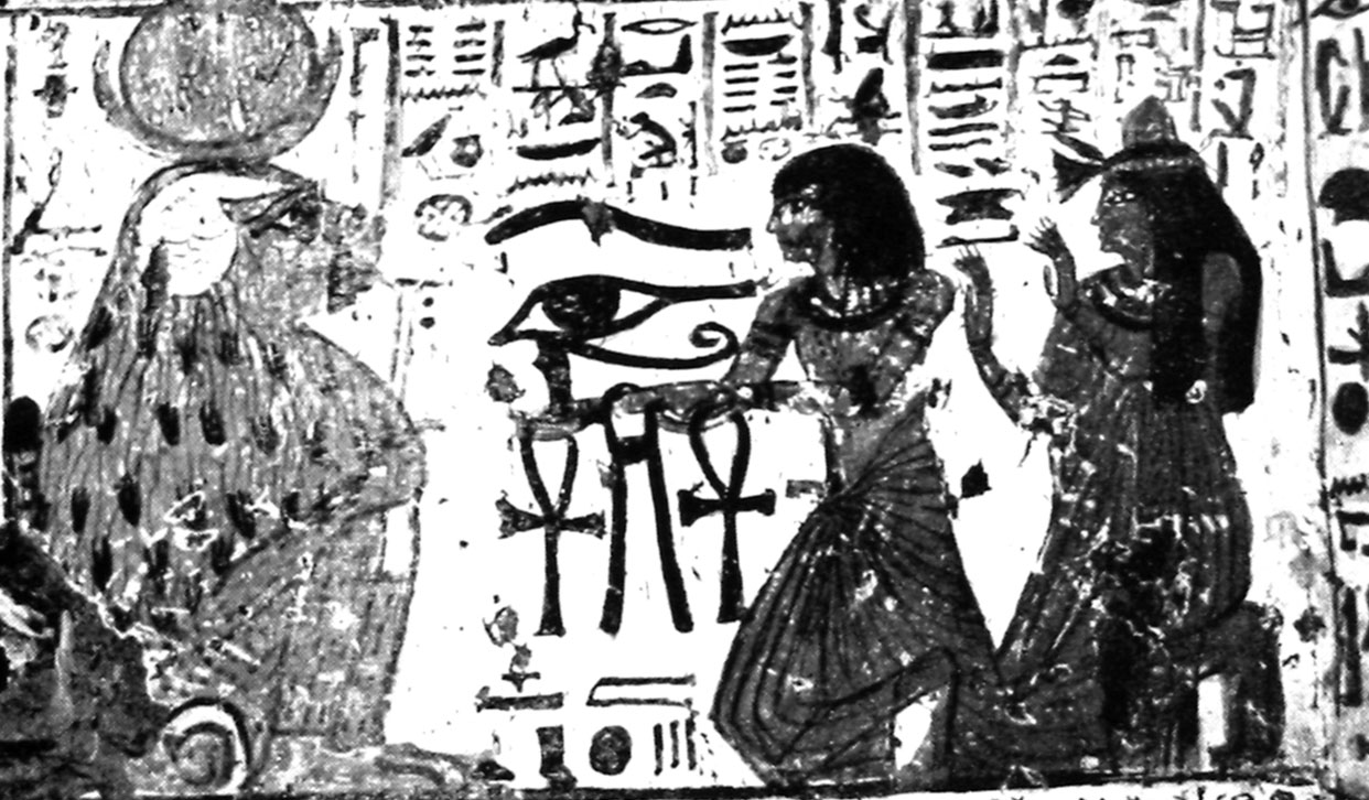 tt002_19_5776: TT002 Khabekhnet – parede 19. Morto e esposa ajoelhados oferecendo "uzat" à Thot como um babuíno. http://www.osirisnet.net/tombes/artisans/khabe/photo/khab_8.jpg. BENDERITTER, Thierry (org.). http://www.osiris.net & LIVET, Jacques. Tombes et Mastabas de l'Ancienne Égypte. Paris: Jacques Livet Ed., s/d. (cena em cor) |