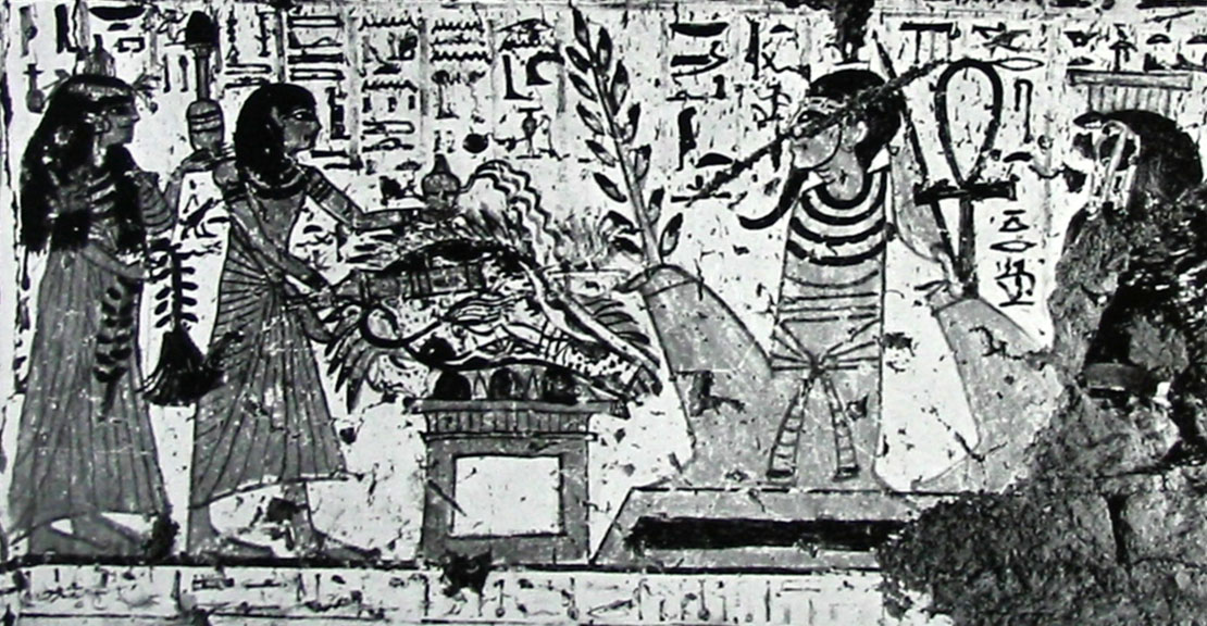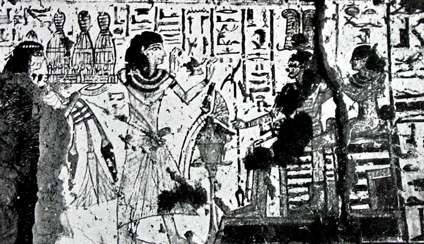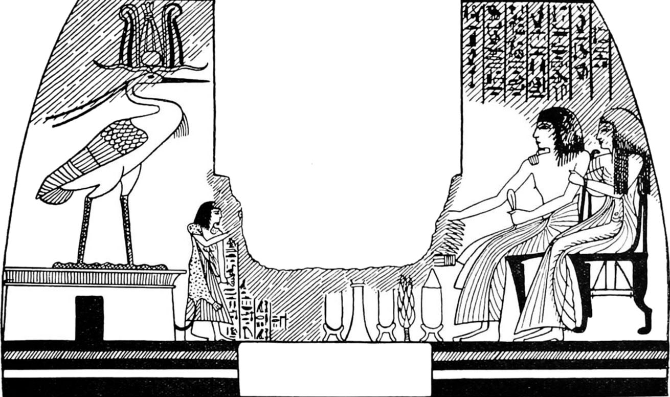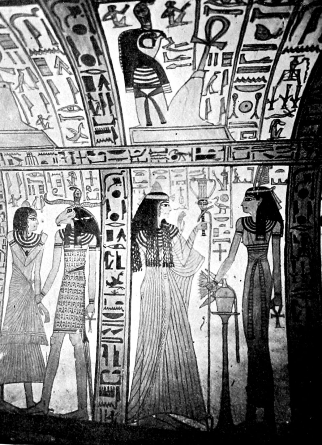tt360_10_1677: TT360 Kaha (Qaha) – parede 10, câmara C P&ássaro benu e filho Huynufer como um sacerdote 'sem' com oferendas (cortadas pela entrada) diante do morto e esposa. BRUYÈRE, M. Bernard. "Rapport sur les fouilles de Deir el Médineh (1930)" IN: IFAO, Fouilles de L'Institut Français d'Archéologie Orientale du Caire Année 1930, tome 8ème, pt3. Le Caire: Imprimerie de L'Institut Français Orientale, 1933. [PL XXVIII Fig. 1]. |