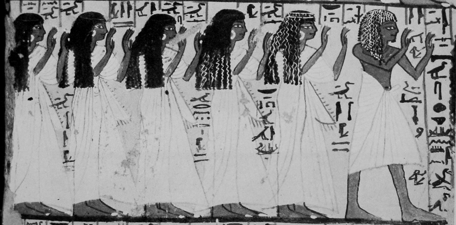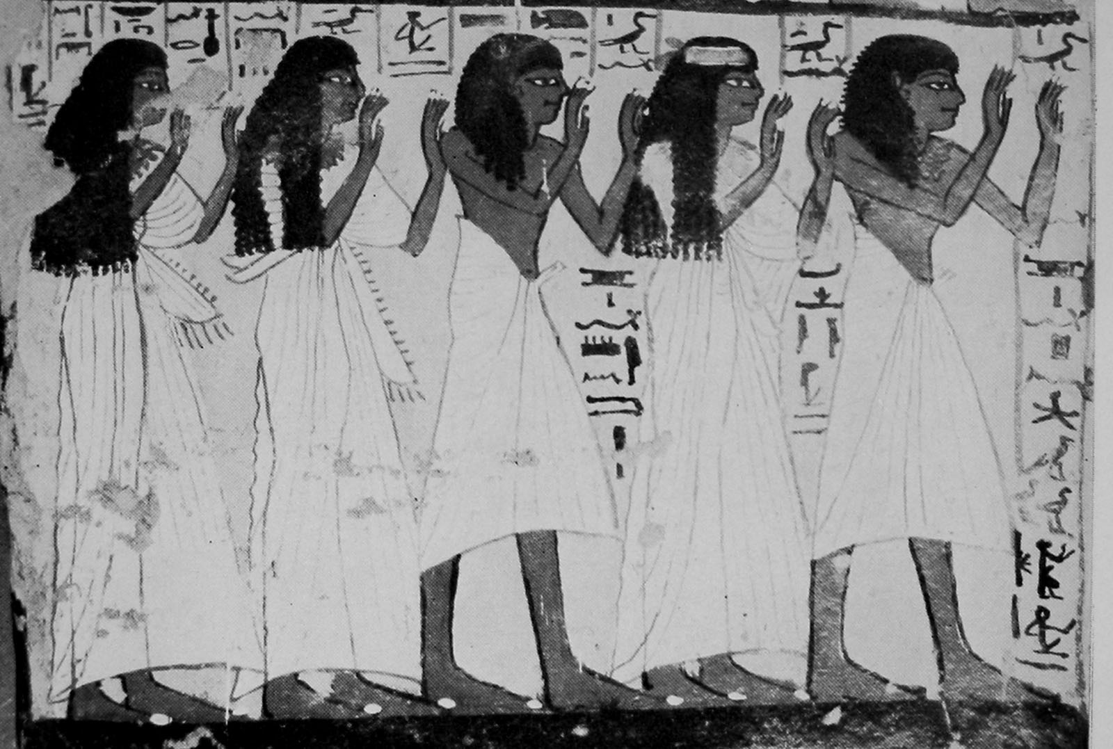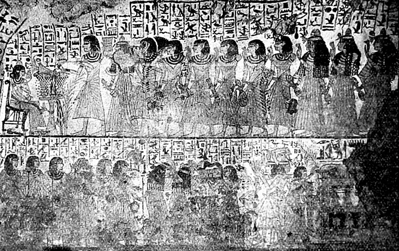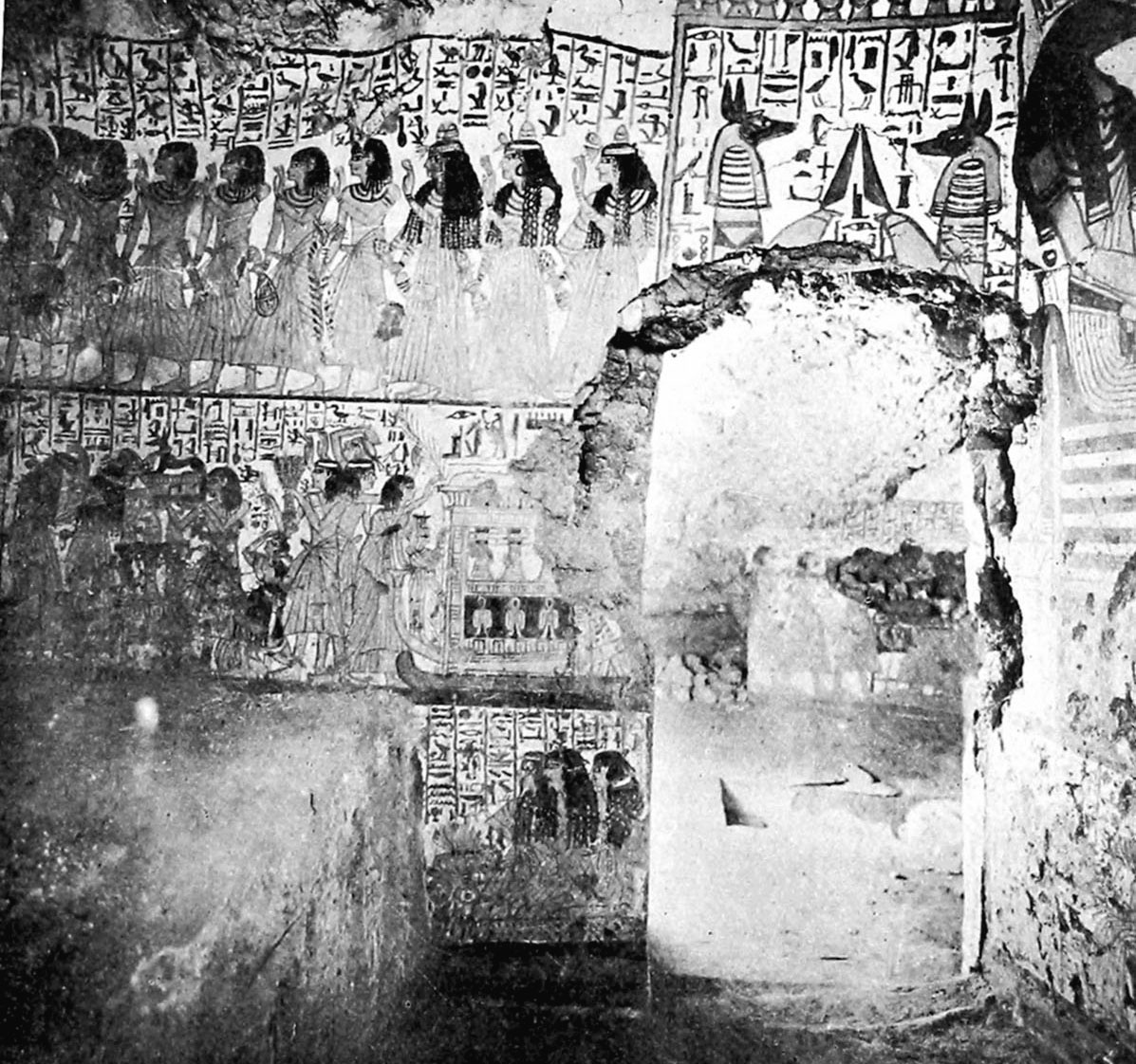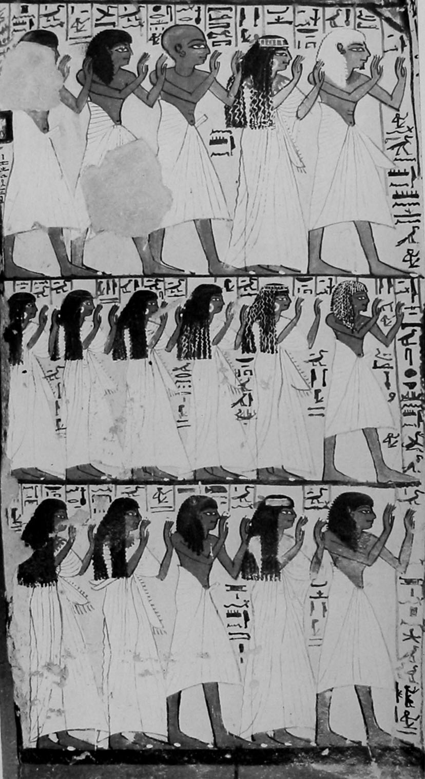 tt250_02-03_0131: TT250 Ra'mosi – paredes 2 e 3 Duas procissões funer&árias de homens e mulheres (procissão direita em direção a quatro múmias de mulheres. BRUYÈRE, M. Bernard. "Rapport sur les fouilles de Deir el Médineh (1926)" IN: IFAO, Fouilles de L'Institut Français d'Archéologie Orientale du Caire Année 1926, tome 4ème, pt3. Le Caire: Imprimerie de L'Institut Français Orientale, 1927. [PL V]. |