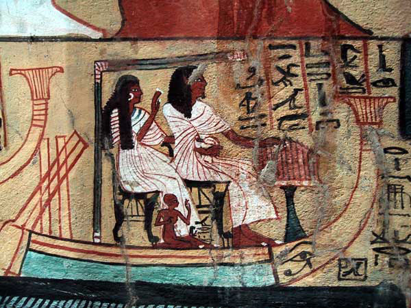 tt003_09_5786: TT003 Pashedu – parede 9 morto e esposa com criança num barco. http://www.osirisnet.net/tombes/artisans/pach/IMG_1538.jpg ©KIHN, Danielle & Jack; BENDERITTER, Thierry (org.). http://www.osiris.net & LIVET, Jacques. Tombes et Mastabas de l'Ancienne Égypte. Paris: Jacques Livet Ed., s/d. (cena em cor) |
