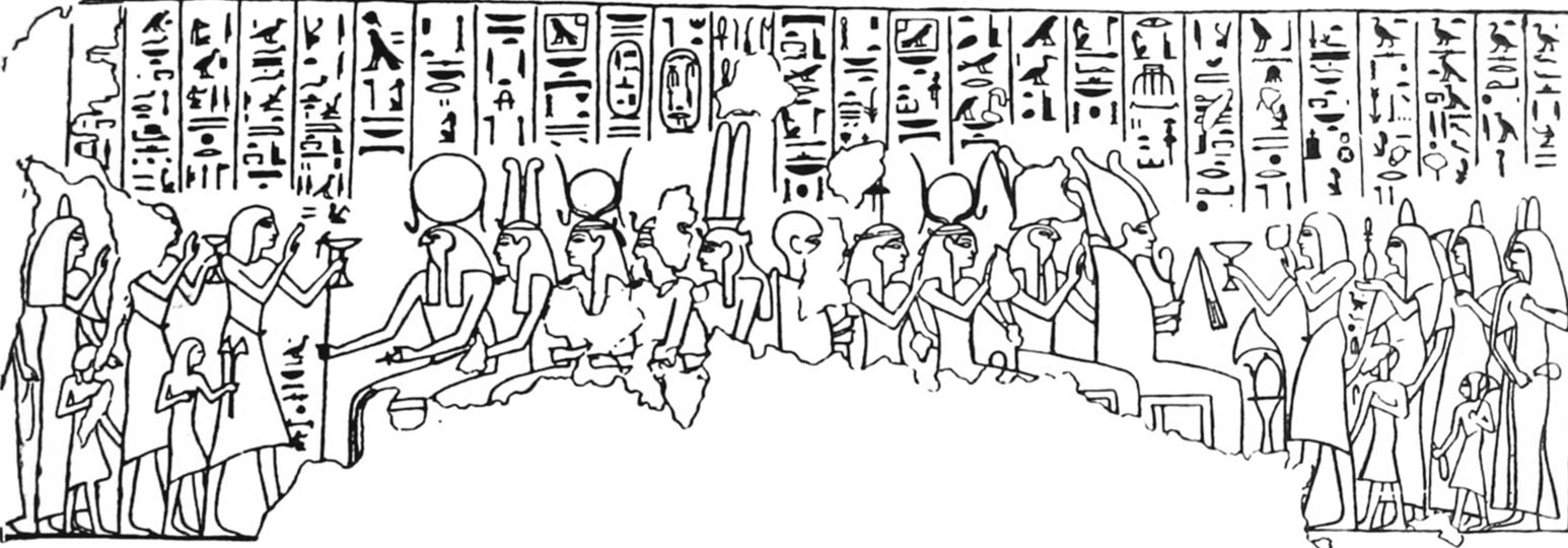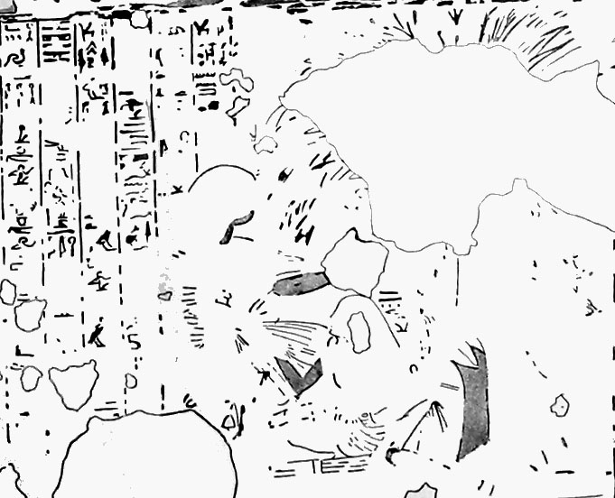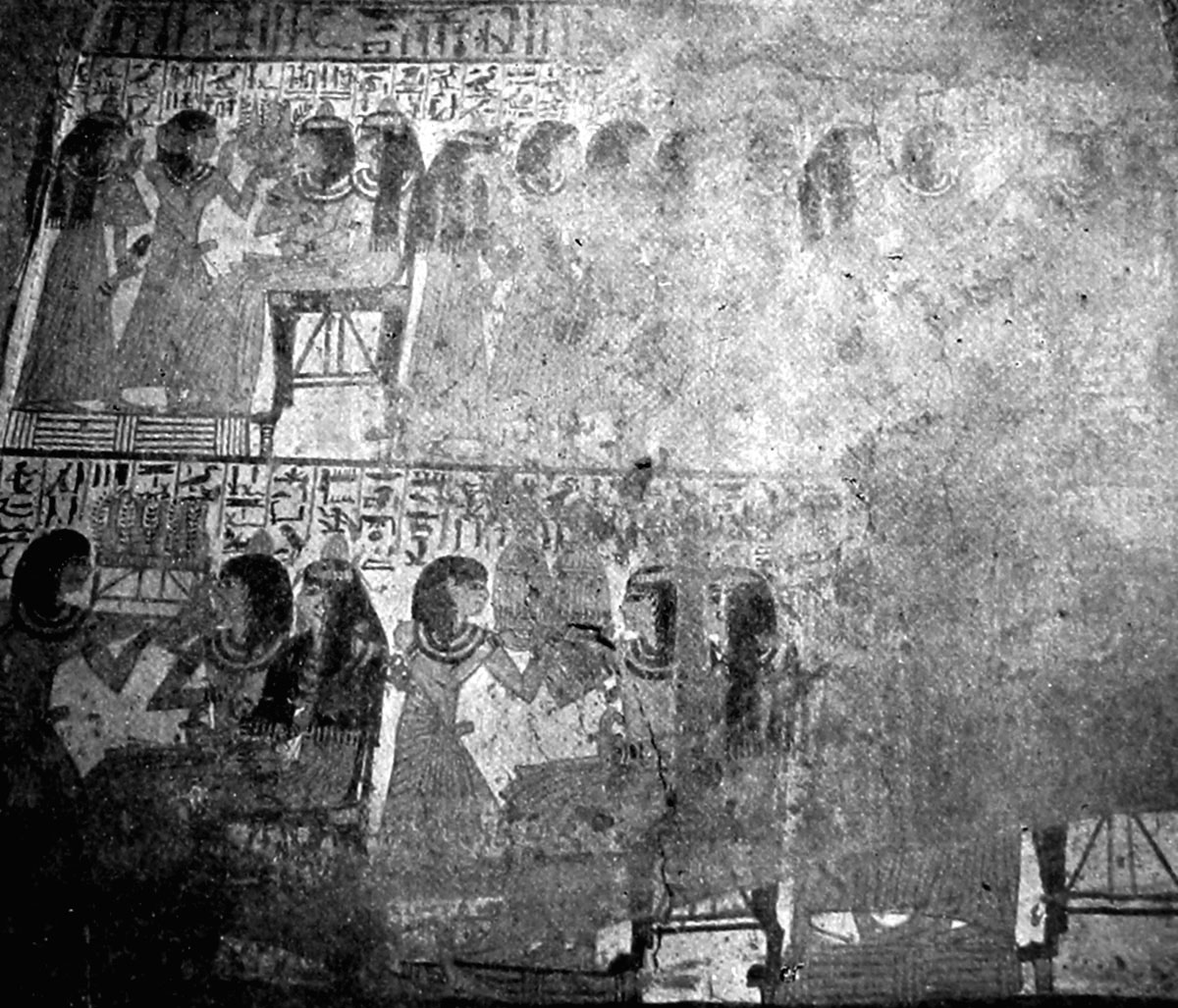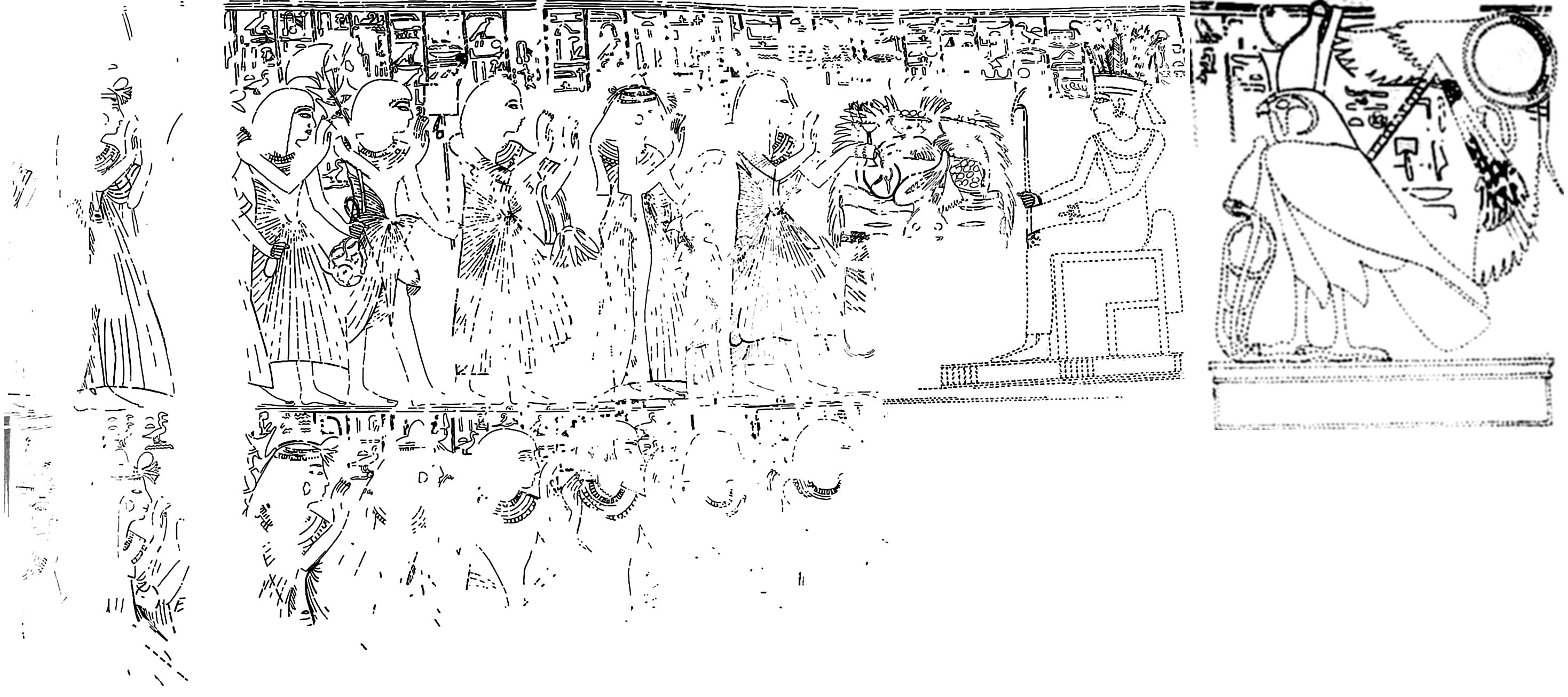 tt335_16_3271: TT335 Nekhtamun – parede 16, registros I e II. BRUYÈRE, M. Bernard. "Rapport sur les fouilles de Deir el Médineh (1924-1925)" IN: IFAO, Fouilles de L'Institut Français d'Archéologie Orientale du Caire Année 1924-1925, tome 3ème, pt2. Le Caire: Imprimerie de L'Institut Français Orientale, 1926. [P&ág. 129 Fig. 88] (detalhe) |