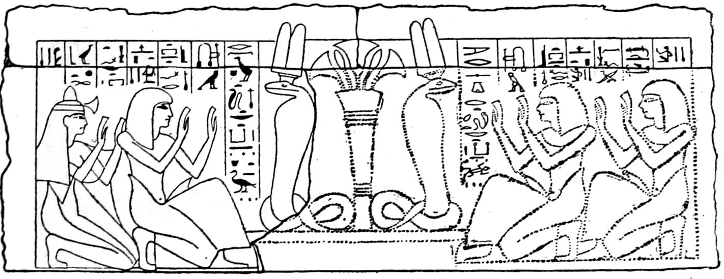 tt216_ni_0001: TT216 Neferhotep – parede não identificada Lintel em calc&ário: Direita - Neferhotep e seu irmão Pasched adoram a MertSeger; Esquerda - Neferhotep e sua esposa adoram Rannout. BRUYÈRE, M. Bernard. "Rapport sur les fouilles de Deir el Médineh (1923-1924)" IN: IFAO, Fouilles de L'Institut Français d'Archéologie Orientale du Caire Année 1923-1924, tome 2ème, pt2. Le Caire: Imprimerie de L'Institut Français Orientale, 1925. [P&ág. 49 Fig. 2]. |