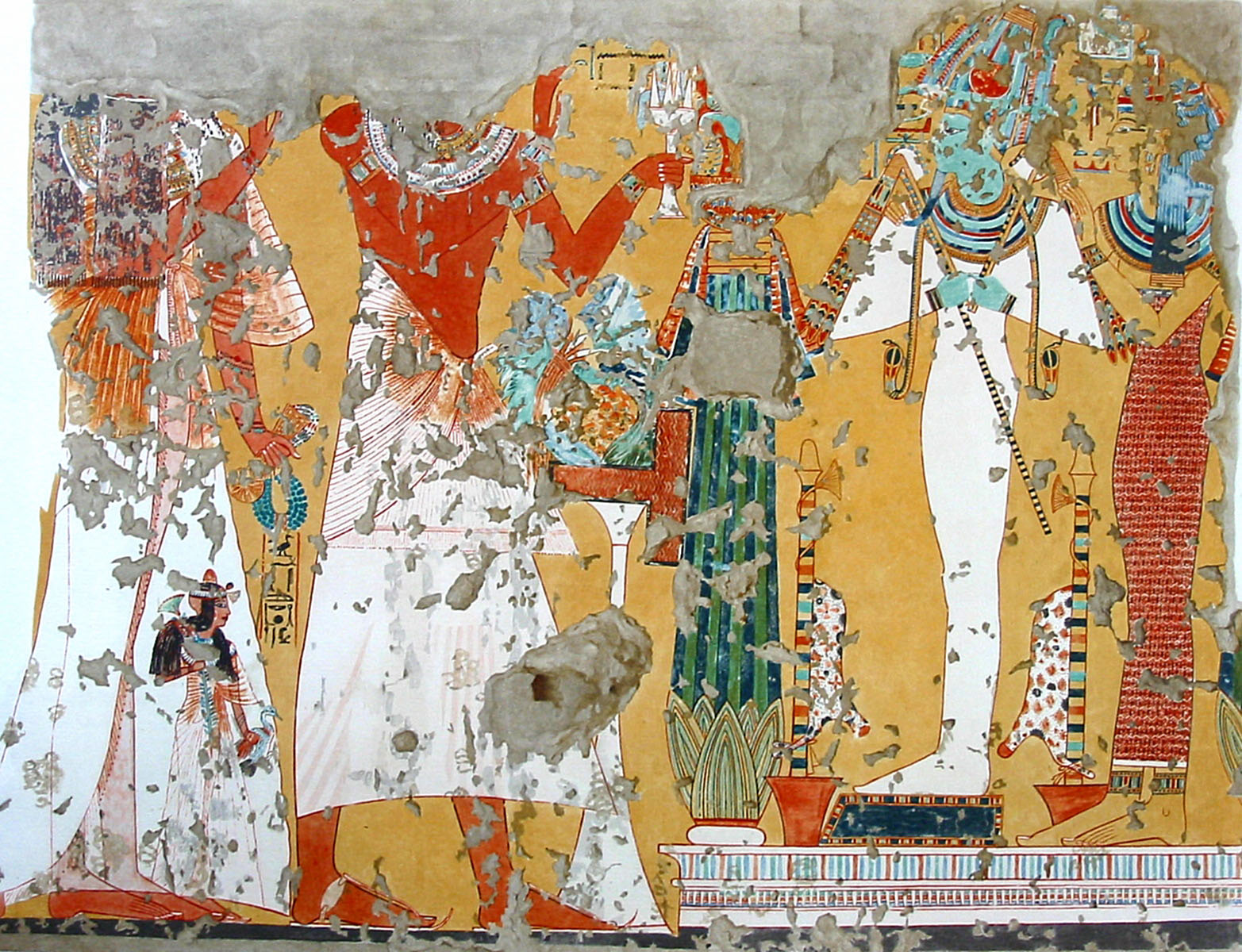 tt335_16_5790: TT335 Nekhtamun – parede 16. http://www.osirisnet.net/tombes/artisans/nakht335/photo/nak335_13.jpg BENDERITTER, Thierry (org.). http://www.osiris.net & LIVET, Jacques. Tombes et Mastabas de l'Ancienne Égypte. Paris: Jacques Livet Ed., s/d. (detalhe de cena em cor) |