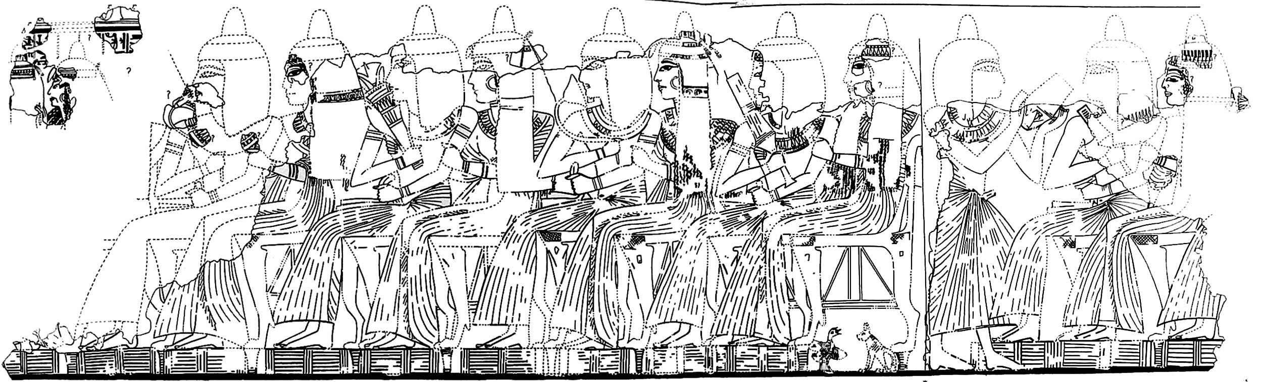 tt336_07bc_3243: TT336 Neferronpet – parede 7 registros II e III Banquete com morto e parentes. BRUYÈRE, M. Bernard. "Rapport sur les fouilles de Deir el Médineh (1924-1925)" IN: IFAO, Fouilles de L'Institut Français d'Archéologie Orientale du Caire Année 1924-1925, tome 3ème, pt2. Le Caire: Imprimerie de L'Institut Français Orientale, 1926. [P&ág. 89 Fig. 59]. |