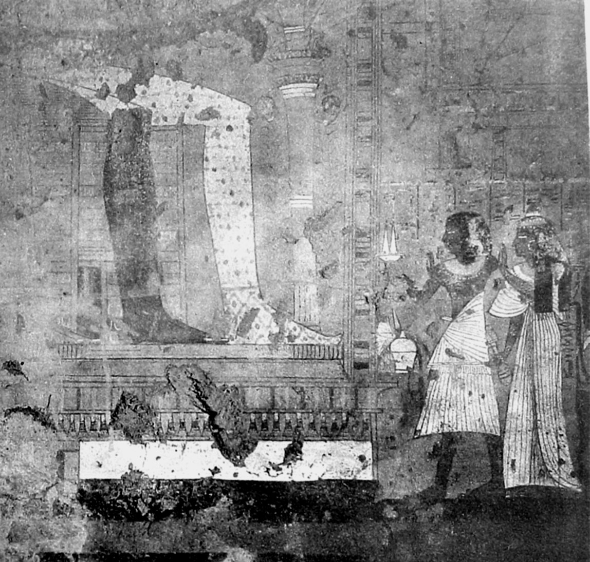 tt356_04_1415: TT356 Amenemwia – parede 4 Filho Amenemonet e filha diante de morto e esposa. BRUYÈRE, M. Bernard. "Rapport sur les fouilles de Deir el Médineh (1928)" IN: IFAO, Fouilles de L'Institut Français d'Archéologie Orientale du Caire Année 1928, tome 6ème, pt2. Le Caire: Imprimerie de L'Institut Français Orientale, 1929. [P&ág. 86 Fig. 46]. |